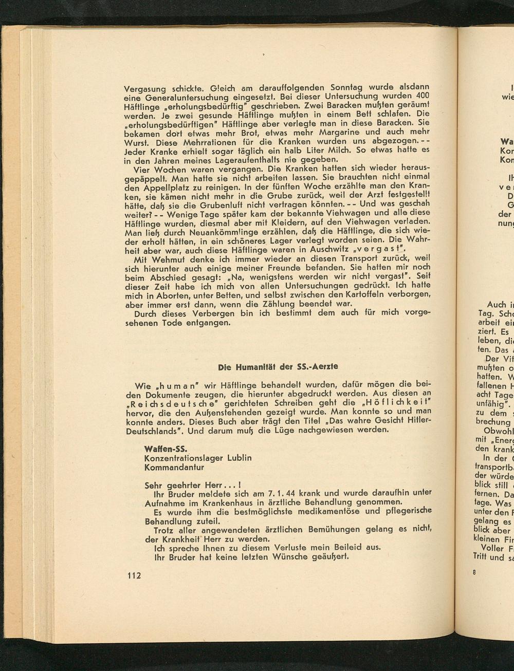 Vergasung schickte. Gleich am darauffolgenden Sonntag wurde alsdann eine Generaluntersuchung eingesetzt. Bei dieser Untersuchung wurden 400 Häftlinge erholungsbedürftig" geschrieben. Zwei Baracken mußten geräumt werden. Je zwei gesunde Häftlinge mußten in einem Bett schlafen. Die erholungsbedürftigen" Häftlinge aber verlegte man in diese Baracken. Sie bekamen dort etwas mehr Brot, etwas mehr Margarine und auch mehr Wurst. Diese Mehrrationen für die Kranken wurden uns abgezogen. Jeder Kranke erhielt sogar täglich ein halb Liter Milch. So etwas hatte es in den Jahren meines Lageraufenthalts nie gegeben.