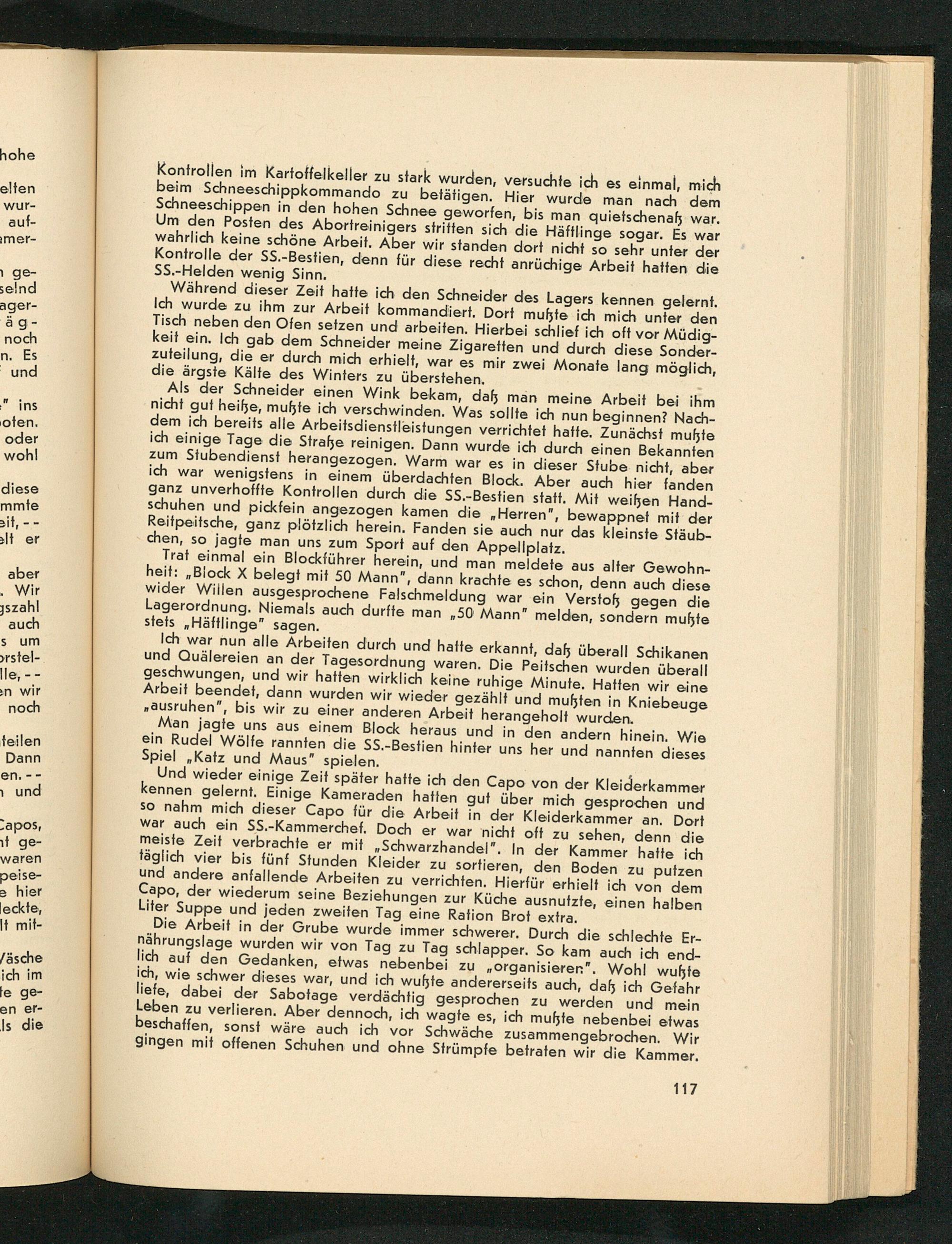 Und wieder einige Zeit später hatte ich den Capo von der Kleiderkammer kennen gelernt. Einige Kameraden hatten gut über mich gesprochen und so nahm mich dieser Capo für die Arbeit in der Kleiderkammer an. Dort war auch ein SS.- Kammerchef. Doch er war nicht oft zu sehen, denn die meiste Zeit verbrachte er mit Schwarzhandel". In der Kammer hatte ich täglich vier bis fünf Stunden Kleider zu sortieren, den Boden zu putzen und andere anfallende Arbeiten zu verrichten. Hierfür erhielt ich von dem Capo, der wiederum seine Beziehungen zur Küche ausnutzte, einen halben Liter Suppe und jeden zweiten Tag eine Ration Brot extra.