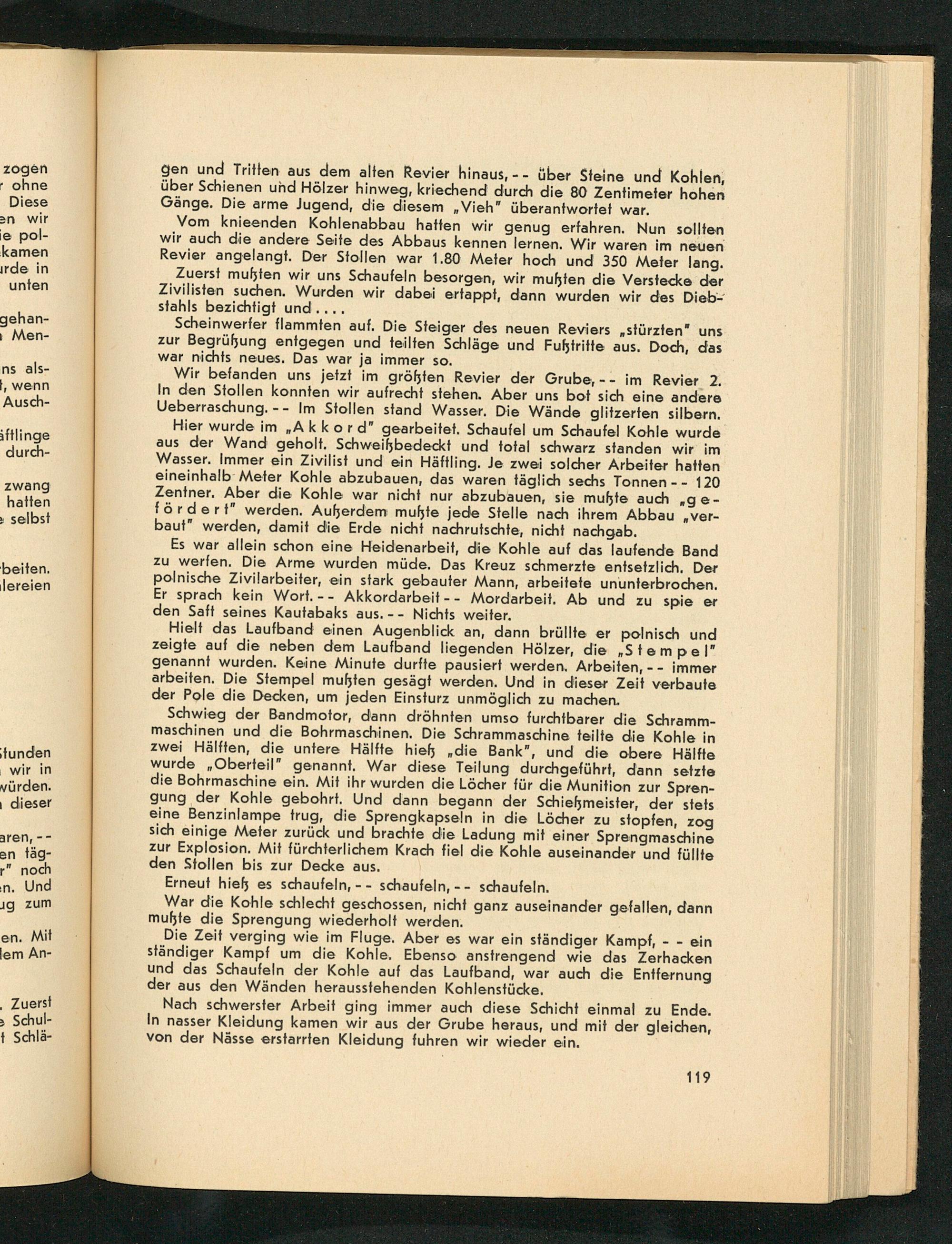 Es war allein schon eine Heidenarbeit, die Kohle auf das laufende Band zu werfen. Die Arme wurden müde. Das Kreuz schmerzte entsetzlich. Der polnische Zivilarbeiter, ein stark gebauter Mann, arbeitete ununterbrochen. Er sprach kein Wort.-- Akkordarbeit-- Mordarbeit, Ab und zu spie er den Saft seines Kautabaks aus.-- Nichts weiter.