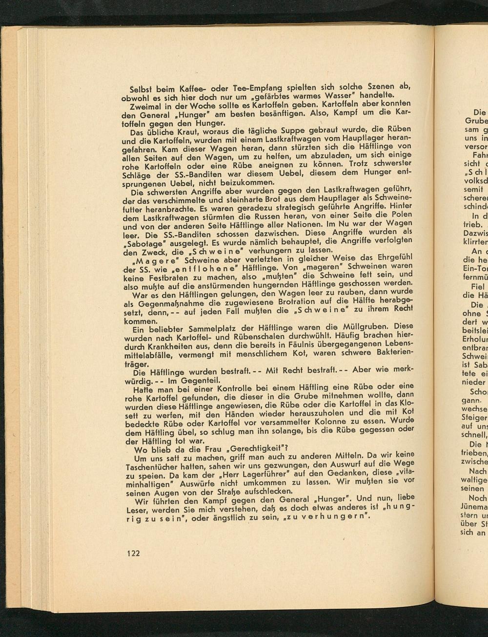 Das übliche Kraut, woraus die tägliche Suppe gebraut wurde, die Rüben und die Kartoffeln, wurden mit einem Lastkraftwagen vom Hauptlager herangefahren. Kam dieser Wagen heran, dann stürzten sich die Häftlinge von allen Seiten auf den Wagen, um zu helfen, um abzuladen, um sich einige rohe Kartoffeln oder eine Rübe aneignen zu können. Trotz schwerster Schläge der SS. - Banditen war diesem Uebel, diesem dem Hunger entsprungenen Uebel, nicht beizukommen.