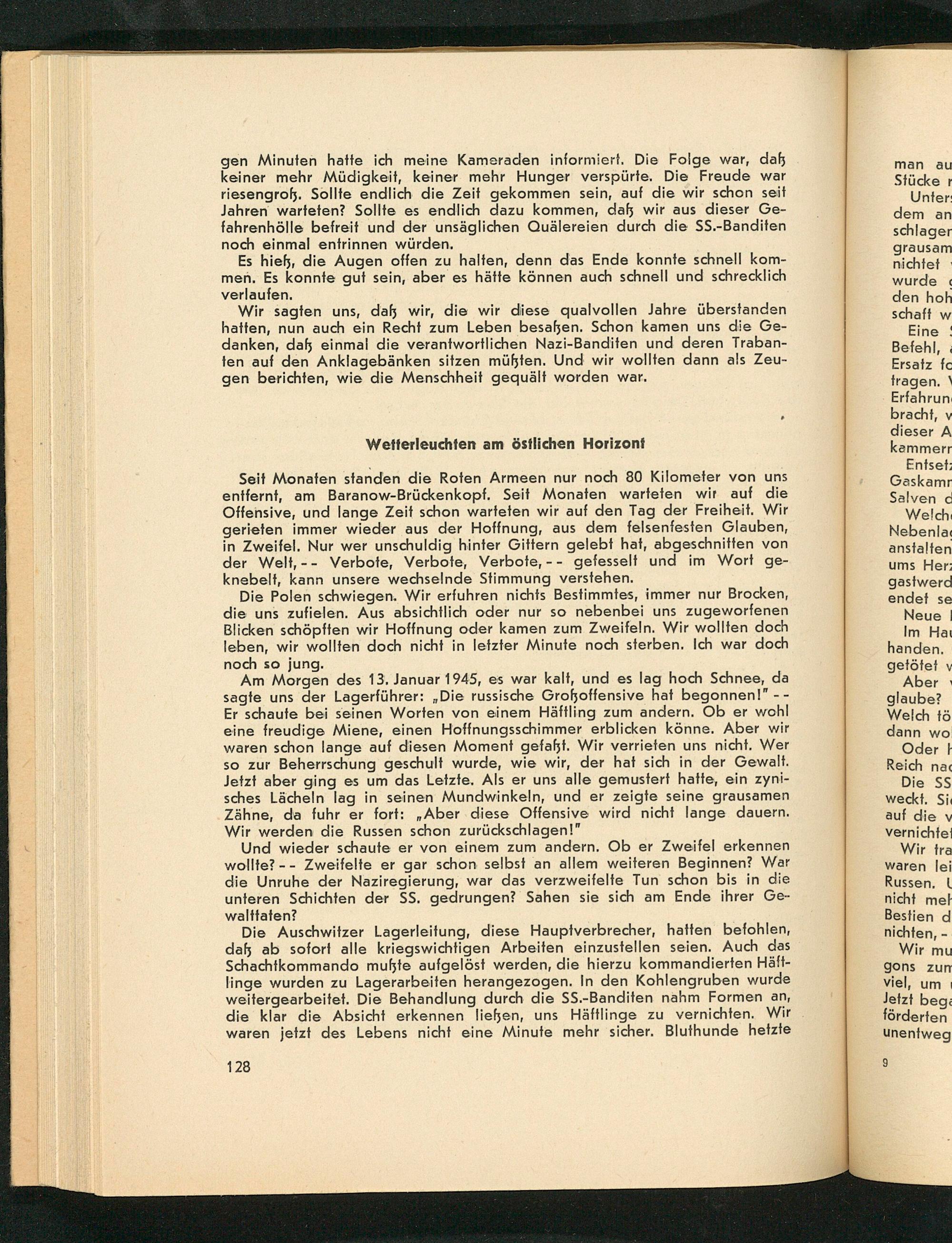 Wir sagten uns, daß wir, die wir diese qualvollen Jahre überstanden hatten, nun auch ein Recht zum Leben besaßen. Schon kamen uns die Gedanken, daß einmal die verantwortlichen Nazi- Banditen und deren Trabanten auf den Anklagebänken sitzen müßten. Und wir wollten dann als Zeugen berichten, wie die Menschheit gequälf worden war.