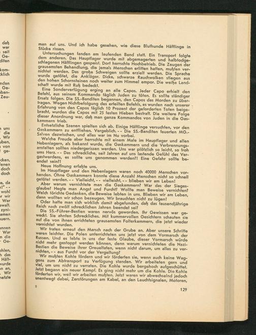 Eine Sonderverfügung erging an alle Capos. Jeder Capo erhielt den Befehl, aus seinem Kommando täglich Juden zu töten. Es sollte ständiger Ersatz folgen. Die SS. -Banditen begannen, den Capos das Morden zu über- tragen. Wegen Nichtbefolgung des erteilten Befehls, es wurden nach unserer Erfahrung von den Capos täglich 10 Prozent der geforderten Toten beige- bracht, wurden die Capos mit 25 festen Hieben bestraft. Die weitere Folge dieser Anordnung war, dak man ganze Kommandos von Juden in die Gas- kammern trieb.