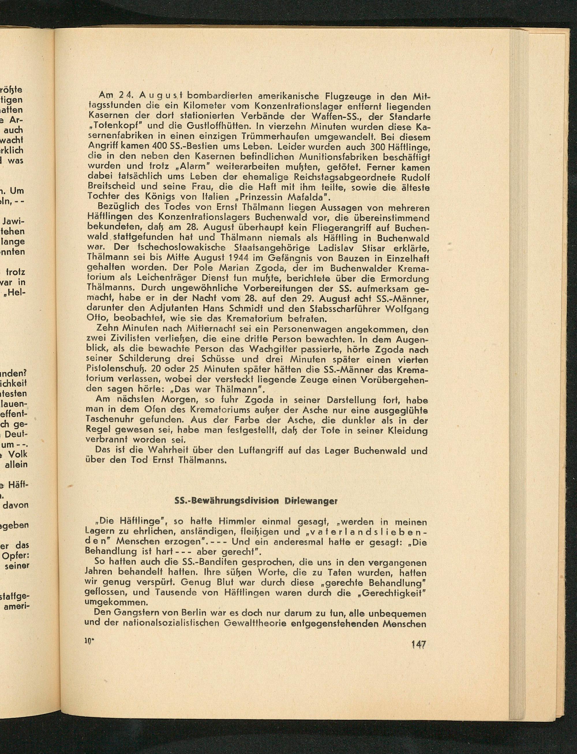 Am 24. August bombardierten amerikanische Flugzeuge in den Mit- tagsstunden die ein Kilometer vom Konzentrationslager entfernt liegenden Kasernen der dort stationierten Verbände der Waffen-SS., der Standarte „Totenkopf" und die Gustloffhütten. In vierzehn Minuten wurden diese Ka- sernenfabriken in einen einzigen Trümmerhaufen umgewandelt. Bei diesem Angriff kamen 400 SS.-Bestien ums Leben. Leider wurden auch 300 Häftlinge, die in den neben den Kasernen befindlichen Munitionsfabriken beschäftigt wurden und trotz„Alarm" weiterarbeiten mußten, getötet. Ferner kamen dabei tatsächlich ums Leben der ehemalige Reichstagsabgeordnete Rudolf Breitscheid und seine Frau, die die Haft mit ihm teilte, sowie die älteste Tochter des Königs von Italien „Prinzessin Mafalda”.