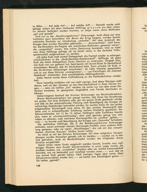 Ueberwiegend bestand die Division Dirlewanger aus Berufsverbrechern. Diesen Berufsverbrechern war gesagt worden, daß ihnen bei Bewährung ein großer Teil ihrer Strafjahre oder gar die ganze Strafe geschenkt würde, und da sie bei entsprechender Führung nach Beendigung des Krieges als vollwertige Staatsbürger betrachtet würden. So wurden ihnen für den ersten mitgemachten Sturmangriff zwei Jahre, für den zweiten Sturmangriff drei Jahre und in entsprechender Erhöhung weitere Strafjahre geschenkt. Ein Schwerverbrecher mit 12 bis 15 Jahren Gefängnis oder Zuchthaus konnte also, wenn er sturmeinsatzfreudig", aber auch gerissen genug war, sein Leben zu schonen, nach mehreren Sturmangriffen als straffrei" gelten,--­und,--- er konnte nach Beendigung des Krieges sein Gewerbe" fortsetzen. Die politischen Häftlinge, die in die Bewährungsdivision Dirlewanger eintraten, waren entweder niemals überzeugte Politiker einer anderen Rich­fung gewesen, oder sie waren" Waschlappen", die sich mit den verspro­chenen Eisernen Kreuzen" ködern lassen hatten.