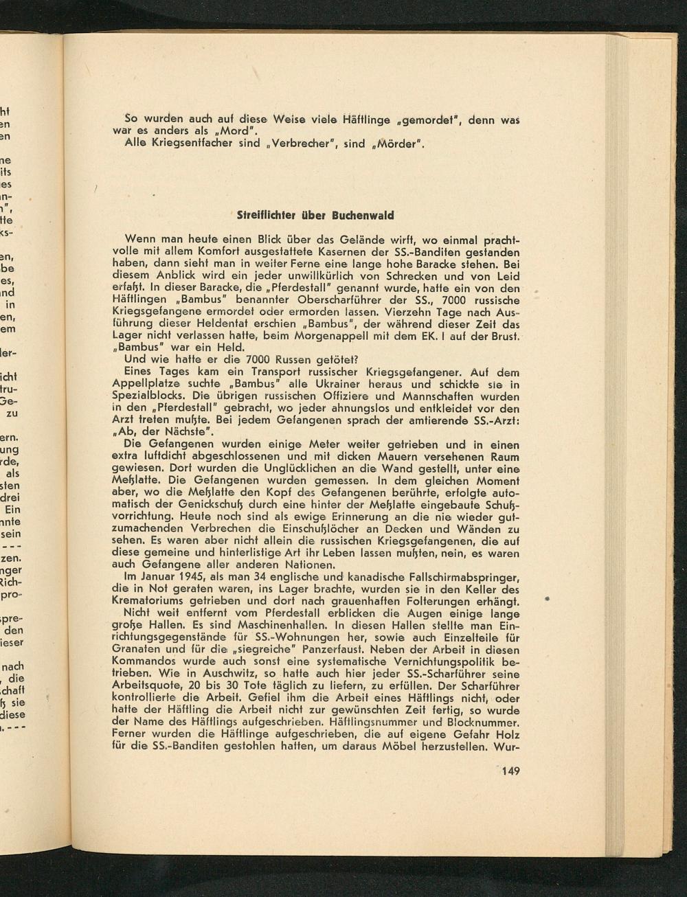 Die Gefangenen wurden einige Meter weiter getrieben und in einen extra luftdicht abgeschlossenen und mit dicken Mauern versehenen Raum gewiesen. Dort wurden die Unglücklichen an die Wand gestellt, unter eine Meßlatte, Die Gefangenen wurden gemessen. In dem gleichen Moment aber, wo die Me&latte den Kopf des Gefangenen berührte, erfolgte auto- mafisch der Genickschuß durch eine hinter der Meblatte eingebaute Schuß- vorrichtung. Heute noch sind als ewige Erinnerung an die nie wieder gut- zumachenden Verbrechen die Einschußlöcher an Decken und Wänden zu sehen. Es waren aber nicht allein die russischen Kriegsgefangenen, die auf diese gemeine und hinterlistige Art ihr Leben lassen muften, nein, es waren auch Gefangene aller anderen Nationen.