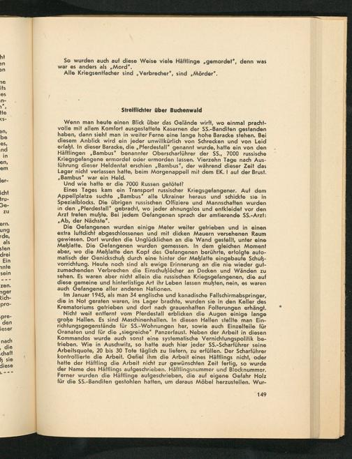 Wenn man heute einen Blick über das Gelände wirft, wo einmal pracht- volle mit allem Komfort ausgestattete Kasernen der SS. -Banditen gestanden haben, dann sieht man in weiter Ferne eine lange hohe Baracke stehen. Bei diesem Anblick wird ein jeder unwillkürlich von Schrecken und von Leid erfaßt. In dieser Baracke, die„Pferdestall” genannt wurde, hatte ein von den Häftlingen„Bambus" benannter Oberscharführer der SS. , 7000 russische Kriegsgefangene ermordet oder ermorden lassen. Vierzehn Tage nach Aus- führung dieser Heldentat erschien„Bambus”, der während dieser Zeit das Lager nicht verlassen hatte, beim Morgenappell mit dem EK. I auf der Brust. „Bambus” war ein Held.