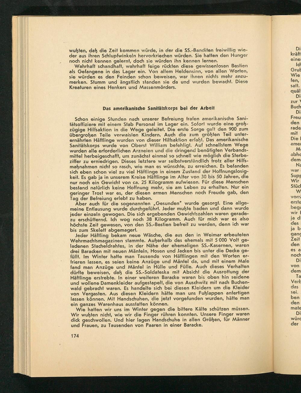 Jeder Häftling bekam neue Wäsche, die aus den in Weimar erbeuteten Wehrmachtsmagazinen stammte. Außerhalb des ehemals mit 5 000 Volt geladenen Stacheldrahtes, in der Nähe der ehemaligen SS. - Kasernen, waren drei Baracken mit neuen Mänteln, Hosen und Jacken bis unter die Decke gefüllt. Im Winter hatte man Tausende von Häftlingen mit den Worten erfrieren lassen, es seien keine Anzüge und Mäntel da, und mit einem Male fand man Anzüge und Mäntel in Hülle und Fülle. Auch dieses Verhalten dürfte beweisen, daß die SS. - Soldateska mit Absicht die Ausrottung der Häftlinge erstrebte. In einer weiteren Baracke waren bis oben hin seidene und wollene Damenkleider aufgestapelt, die von Auschwitz mit nach Buchenwald gebracht waren. Es handelte sich bei diesen Kleidern um die Kleider von Vergasten. Aus diesen Kleidern hätte man uns Fußlappen anfertigen lassen können. Mit Handschuhen, die jetzt vorgefunden wurden, hätte man ein ganzes Warenhaus ausstatten können.