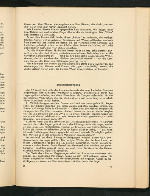 Am 12. April 1945 hatte der Kommandierende der amerikanischen Truppen angeordnet, daß sämtliche Weimarer Einwohner zwangsweise durch das Lager geführt würden, um diese Einwohner als Zeugen aufzurufen für die bestialischen Verbrechen, die die SS .- Banditen zwölf Jahre lang an unschuldigen Menschen verübt hatten.