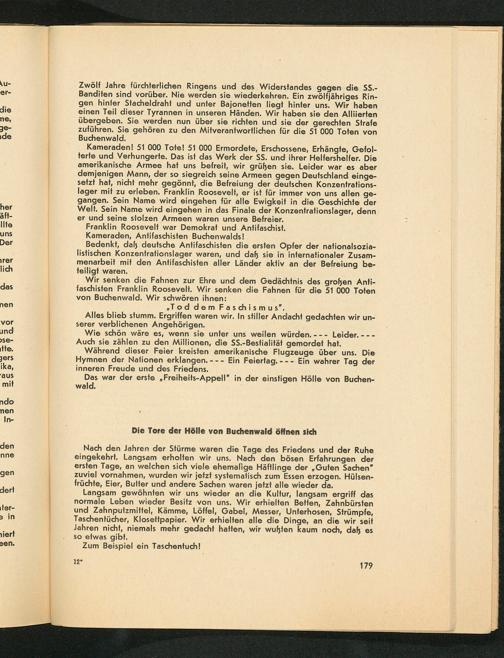 Zwölf Jahre fürchterlichen Ringens und des Widerstandes gegen die SS. Banditen sind vorüber. Nie werden sie wiederkehren. Ein zwölfjähriges Ringen hinter Stacheldraht und unter Bajonetten liegt hinter uns. Wir haben einen Teil dieser Tyrannen in unseren Händen. Wir haben sie den Alliierten übergeben. Sie werden nun über sie richten und sie der gerechten Strafe zuführen. Sie gehören zu den Mitverantwortlichen für die 51 000 Toten von Buchenwald .