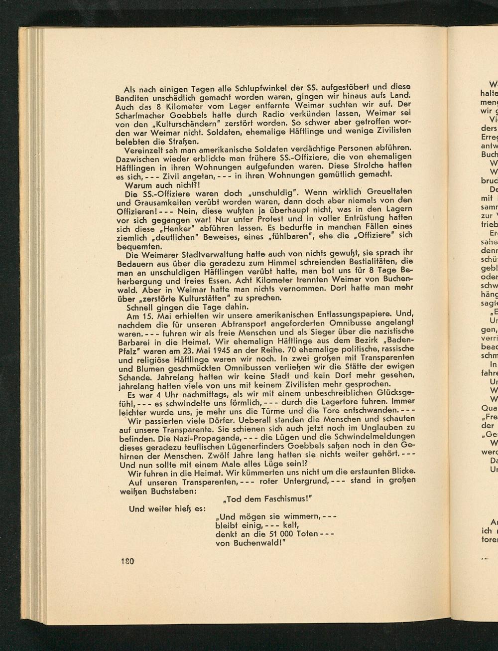 Die Weimarer Stadtverwaltung hatte auch von nichts gewußt, sie sprach ihr Bedauern aus über die geradezu zum Himmel schreienden Bestialitäten, die man an unschuldigen Häftlingen verübt hatte, man bot uns für 8 Tage Be- herbergung und freies Essen. Acht Kilometer trennten Weimar von Buchen- wald. Aber in Weimar hatte man nichts vernommen. Dort hatte man mehr über„zerstörte Kulturstätten” zu sprechen.