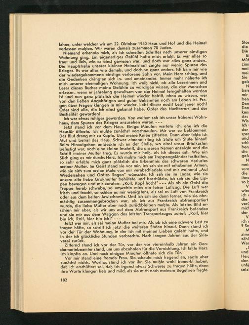 Jetzt stand ich vor dem Haus. Einige Minuten wartete ich, ehe ich die Haustür öffnete. Ich mußte zunächst verschnaufen. Mir war so beklommen. Das Blut drang mir zu Kopfe. Und meine Kniee zitterten. Dann aber faßte ich Mut und betrat das Haus. Schwer atmend stieg ich Stufe um Stufe hinauf. Beim Hinaufgehen entdeckte ich an der Stelle, wo einst unser Briefkasten befestigt war, noch eine kleine Inschrift, die unseren Namen anzeigte und die Schrift meiner Mutter frug. Es wurde mir heiß, als ich dieses sah. Wie ein Stich ging es mir durchs Herz. Ich mußte mich am Treppengeländer festhalten, so sehr erfaßte mich ganz plötzlich die Erkenntnis des schweren Verlustes meiner Mutter. Im Geist stand sie vor mir. Ich sah sie mit erhobenen Armen, wie sie sich zum ersten Male von mir verabschiedete und mir weinend„ Auf Wiedersehen und Gottes Segen" wünschte. Ich sah sie im Lager, wie sie unsere alte liebe Großmutter behütete und beschützte, ich sah sie die Lippen bewegen und mir zurufen:" Rolf, Kopf hoch!"--- Als ob ein Geist die Treppe herab schwebe, so umwehte mich ein leiser Luftzug. Die Luft war frisch und feucht, so schien es mir wenigstens, als sei es Luft von Frankreich oder aus dem kalten Jawischowitz. Und ich sah sie dann ferner, wie sie ohnmächtig zusammengebrochen war, als ich aus Frankreich abtransportiert wurde, die liebe Mutter aber noch zurückbleiben mußte. Als letztes Bild erschien mir aber, als wir uns auf dem Abtransport aus Frankreich befanden und sie mir aus dem Waggon des letzten Transportzuges zurief:" Rolf, hier bin ich, Rolf, hier bin ich!"-