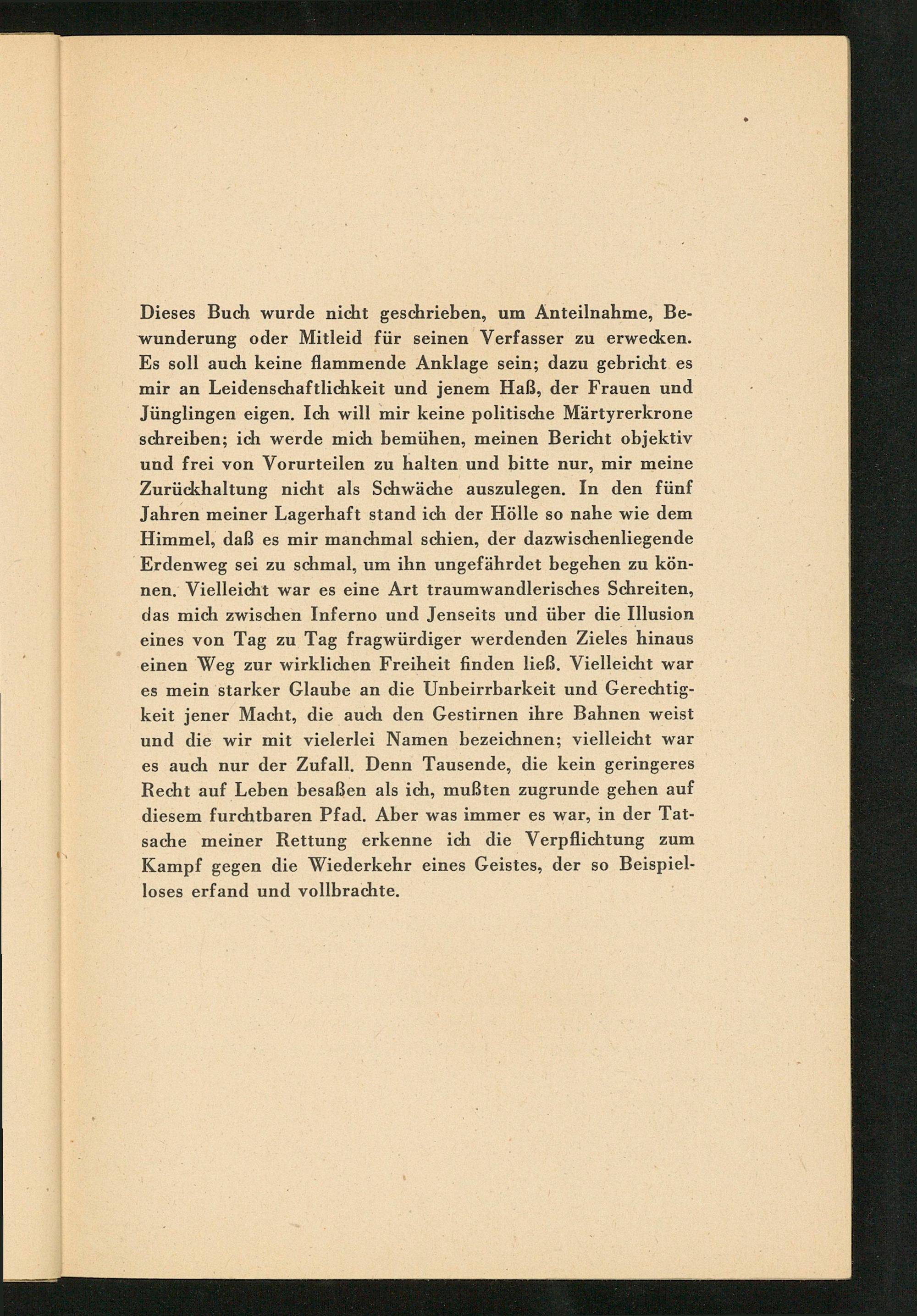 Dieses Buch wurde nicht geschrieben, um Anteilnahme, Bewunderung oder Mitleid für seinen Verfasser zu erwecken. Es soll auch keine flammende Anklage sein; dazu gebricht es mir an Leidenschaftlichkeit und jenem Haß, der Frauen und Jünglingen eigen. Ich will mir keine politische Märtyrerkrone schreiben; ich werde mich bemühen, meinen Bericht objektiv und frei von Vorurteilen zu halten und bitte nur, mir meine Zurückhaltung nicht als Schwäche auszulegen. In den fünf Jahren meiner Lagerhaft stand ich der Hölle so nahe wie dem Himmel, daß es mir manchmal schien, der dazwischenliegende Erdenweg sei zu schmal, um ihn ungefährdet begehen zu können. Vielleicht war es eine Art traumwandlerisches Schreiten, das mich zwischen Inferno und Jenseits und über die Illusion eines von Tag zu Tag fragwürdiger werdenden Zieles hinaus einen Weg zur wirklichen Freiheit finden ließ. Vielleicht war es mein starker Glaube an die Unbeirrbarkeit und Gerechtigkeit jener Macht, die auch den Gestirnen ihre Bahnen weist und die wir mit vielerlei Namen bezeichnen; vielleicht war es auch nur der Zufall. Denn Tausende, die kein geringeres Recht auf Leben besaßen als ich, mußten zugrunde gehen auf diesem furchtbaren Pfad. Aber was immer es war, in der Tatsache meiner Rettung erkenne ich die Verpflichtung zum Kampf gegen die Wiederkehr eines Geistes, der so Beispielloses erfand und vollbrachte.