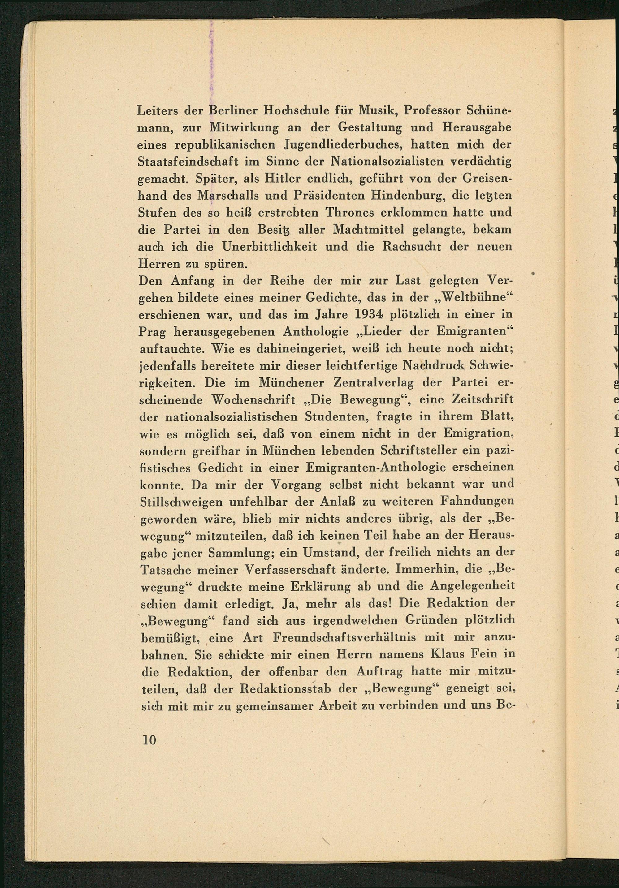 Den Anfang in der Reihe der mir zur Last gelegten Vergehen bildete eines meiner Gedichte, das in der„, Weltbühne" erschienen war, und das im Jahre 1934 plötzlich in einer in Prag herausgegebenen Anthologie„ Lieder der Emigranten" auftauchte. Wie es dahineingeriet, weiß ich heute noch nicht; jedenfalls bereitete mir dieser leichtfertige Nachdruck Schwierigkeiten. Die im Münchener Zentralverlag der Partei erscheinende Wochenschrift„ Die Bewegung", eine Zeitschrift der nationalsozialistischen Studenten, fragte in ihrem Blatt, wie es möglich sei, daß von einem nicht in der Emigration, sondern greifbar in München lebenden Schriftsteller ein pazifistisches Gedicht in einer Emigranten- Anthologie erscheinen konnte. Da mir der Vorgang selbst nicht bekannt war und Stillschweigen unfehlbar der Anlaß zu weiteren Fahndungen geworden wäre, blieb mir nichts anderes übrig, als der„ Bewegung" mitzuteilen, daß ich keinen Teil habe an der Herausgabe jener Sammlung; ein Umstand, der freilich nichts an der Tatsache meiner Verfasserschaft änderte. Immerhin, die ,, Bewegung" druckte meine Erklärung ab und die Angelegenheit schien damit erledigt. Ja, mehr als das! Die Redaktion der ,, Bewegung" fand sich aus irgendwelchen Gründen plötzlich bemüßigt, eine Art Freundschaftsverhältnis mit mir anzubahnen. Sie schickte mir einen Herrn namens Klaus Fein in die Redaktion, der offenbar den Auftrag hatte mir mitzuteilen, daß der Redaktionsstab der ,, Bewegung" geneigt sei, sich mit mir zu gemeinsamer Arbeit zu verbinden und uns Be