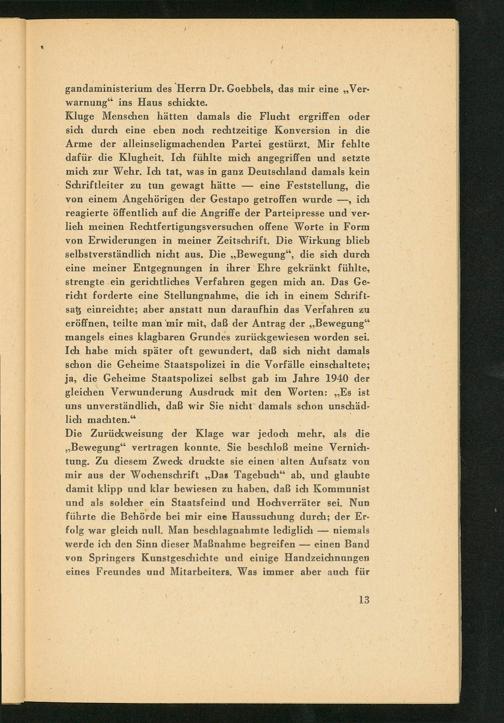 Die Zurückweisung der Klage war jedoch mehr, als die ,, Bewegung" vertragen konnte. Sie beschloß meine Vernichtung. Zu diesem Zweck druckte sie einen alten Aufsatz von mir aus der Wochenschrift ,, Das Tagebuch" ab, und glaubte damit klipp und klar bewiesen zu haben, daß ich Kommunist und als solcher ein Staatsfeind und Hochverräter sei. Nun führte die Behörde bei mir eine Haussuchung durch; der Erfolg war gleich null. Man beschlagnahmte lediglich niemals werde ich den Sinn dieser Maßnahme begreifen- einen Band von Springers Kunstgeschichte und einige Handzeichnungen eines Freundes und Mitarbeiters. Was immer aber auch für