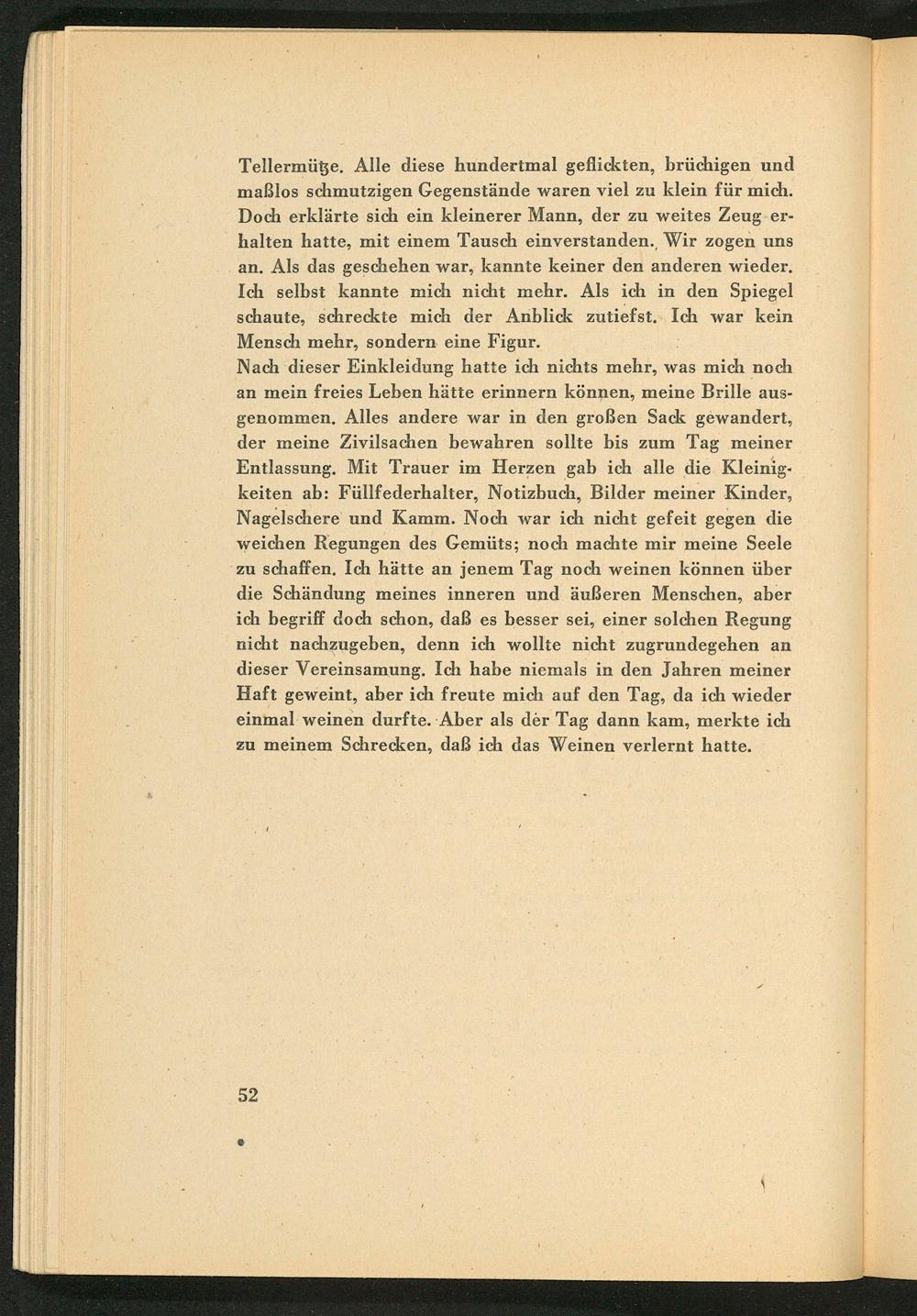 Nach dieser Einkleidung hatte ich nichts mehr, was mich noch an mein freies Leben hätte erinnern können, meine Brille ausgenommen. Alles andere war in den großen Sack gewandert, der meine Zivilsachen bewahren sollte bis zum Tag meiner Entlassung. Mit Trauer im Herzen gab ich alle die Kleinigkeiten ab: Füllfederhalter, Notizbuch, Bilder meiner Kinder, Nagelschere und Kamm. Noch war ich nicht gefeit gegen die weichen Regungen des Gemüts; noch machte mir meine Seele zu schaffen. Ich hätte an jenem Tag noch weinen können über die Schändung meines inneren und äußeren Menschen, aber ich begriff doch schon, daß es besser sei, einer solchen Regung nicht nachzugeben, denn ich wollte nicht zugrundegehen an dieser Vereinsamung. Ich habe niemals in den Jahren meiner Haft geweint, aber ich freute mich auf den Tag, da ich wieder einmal weinen durfte. Aber als der Tag dann kam, merkte ich zu meinem Schrecken, daß ich das Weinen verlernt hatte.