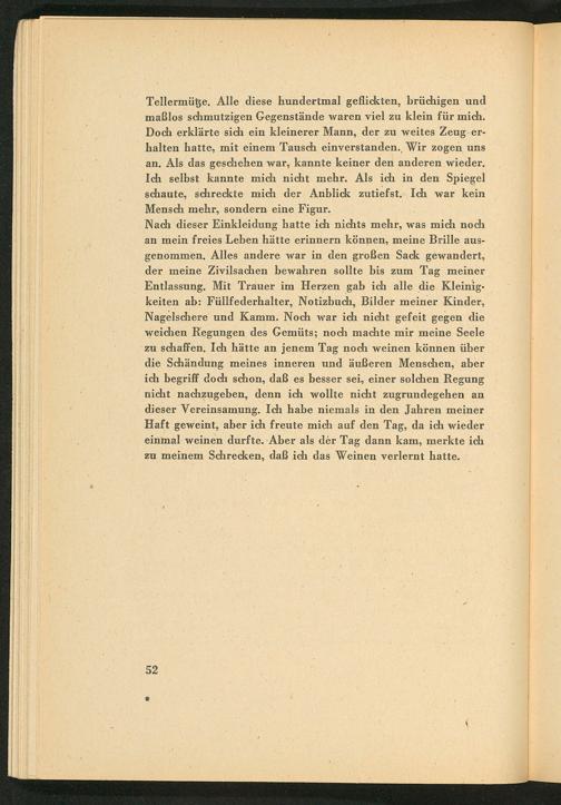Tellermütze. Alle diese hundertmal geflickten, brüchigen und maßlos schmutzigen Gegenstände waren viel zu klein für mich. Doch erklärte sich ein kleinerer Mann, der zu weites Zeug erhalten hatte, mit einem Tausch einverstanden., Wir zogen uns an. Als das geschehen war, kannte keiner den anderen wieder. Ich selbst kannte mich nicht mehr. Als ich in den Spiegel schaute, schreckte mich der Anblick zutiefst. Ich war kein Mensch mehr, sondern eine Figur.