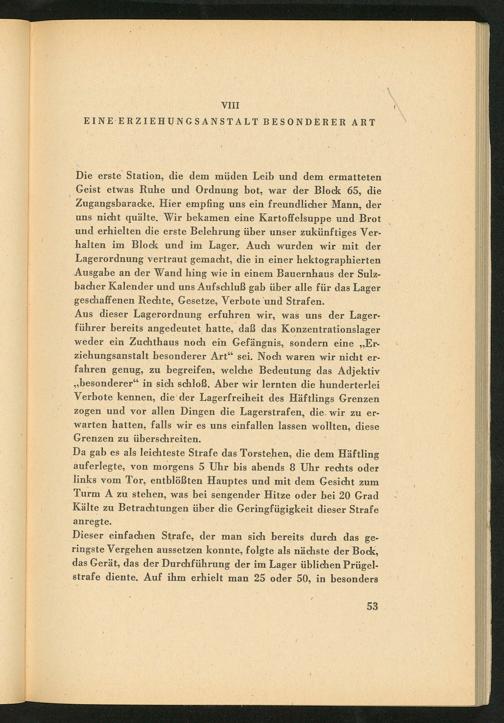 Die erste Station, die dem müden Leib und dem ermatteten Geist etwas Ruhe und Ordnung bot, war der Block 65, die Zugangsbaracke. Hier empfing uns ein freundlicher Mann, der uns nicht quälte. Wir bekamen eine Kartoffelsuppe und Brot und erhielten die erste Belehrung über unser zukünftiges Verhalten im Block und im Lager. Auch wurden wir mit der Lagerordnung vertraut gemacht, die in einer hektographierten Ausgabe an der Wand hing wie in einem Bauernhaus der Sulzbacher Kalender und uns Aufschluß gab über alle für das Lager geschaffenen Rechte, Gesetze, Verbote und Strafen. Aus dieser Lagerordnung erfuhren wir, was uns der Lagerführer bereits angedeutet hatte, daß das Konzentrationslager weder ein Zuchthaus noch ein Gefängnis, sondern eine ,, Erziehungsanstalt besonderer Art" sei. Noch waren wir nicht erfahren genug, zu begreifen, welche Bedeutung das Adjektiv ..besonderer" in sich schloß. Aber wir lernten die hunderterlei Verbote kennen, die der Lagerfreiheit des Häftlings Grenzen zogen und vor allen Dingen die Lagerstrafen, die wir zu erwarten hatten, falls wir es uns einfallen lassen wollten, diese Grenzen zu überschreiten.