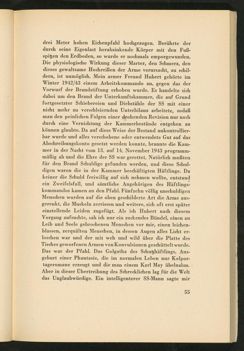 drei Meter hohen Eichenpfahl hochgezogen. Berührte der durch seine Eigenlast herabsinkende Körper mit den Fußspitzen den Erdboden, so wurde er nochmals emporgewunden. Die physiologische Wirkung dieser Marter, den Schmerz, den dieses gewaltsame Hochreißen der Arme verursacht, zu schildern, ist unmöglich. Mein armer Freund Hubert gehörte im Winter 1942/43 einem Arbeitskommando an, gegen das der Vorwurf der Brandstiftung erhoben wurde. Es handelte sich dabei um den Brand der Unterkunftskammer, die auf Grund fortgesetzter Schiebereien und Diebstähle der SS mit einer nicht mehr zu verschleiernden Unterbilanz arbeitete, sodaẞ man den peinlichen Folgen einer drohenden Revision nur noch durch eine Vernichtung der Kammerbestände entgehen zu können glaubte. Da auf diese Weise der Bestand unkontrollierbar wurde und alles verschobene oder entwendete Gut auf das Abschreibungskonto gesetzt werden konnte, brannte die Kammer in der Nacht vom 13. auf 14. November 1943 programmmäßig ab und die Ehre der SS war gerettet. Natürlich mußten für den Brand Schuldige gefunden werden, und diese Schuldigen waren die in der Kammer beschäftigten Häftlinge. Da keiner die Schuld freiwillig auf sich nehmen wollte, entstand ein Zweifelsfall, und sämtliche Angehörigen des Häftlingskommandos kamen an den Pfahl. Fünfzehn völlig unschuldigen Menschen wurden auf die oben geschilderte Art die Arme ausgerenkt, die Muskeln zerrissen und weitere, sich oft erst später einstellende Leiden zugefügt. Als ich Hubert nach diesem Vorgang aufsuchte, sah ich nur ein zuckendes Bündel, einen an Leib und Seele gebrochenen Menschen vor mir, einen leichenblassen, zerquälten Menschen, in dessen Augen alles Licht erloschen war und der mit weh und wild über die Platte des Tisches geworfenen Armen von Konvulsionen geschüttelt wurde. Das war der Pfahl. Das Golgatha des Schutzhäftlings, Ausgeburt einer Phantasie, die im normalen Leben nur Kolportageromane erzeugt und die man einem Karl May übelnahm. Aber in dieser Übertreibung des Schrecklichen lag für die Welt das Unglaubwürdige. Ein intelligenterer SS- Mann sagte mir