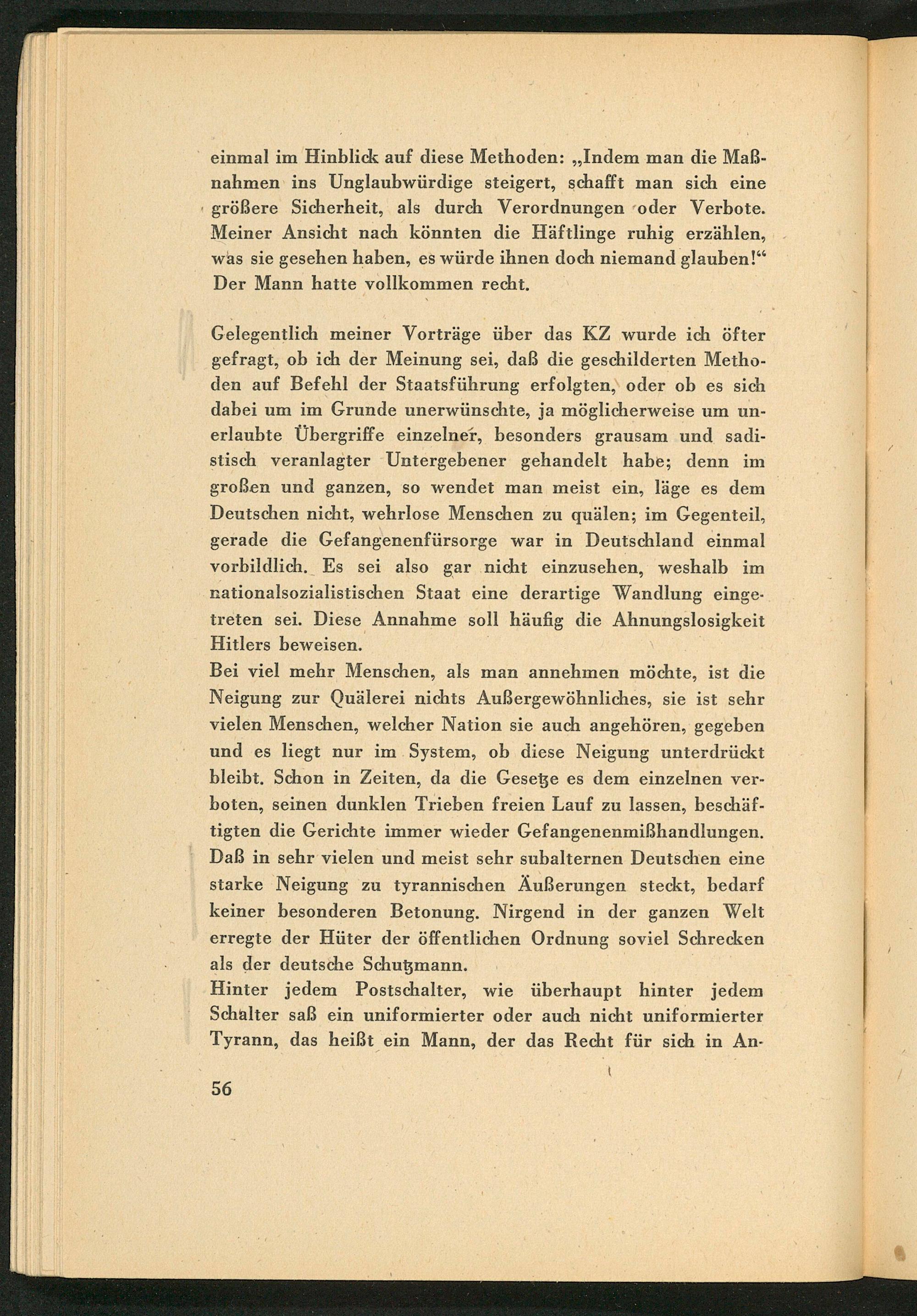 Bei viel mehr Menschen, als man annehmen möchte, ist die Neigung zur Quälerei nichts Außergewöhnliches, sie ist sehr vielen Menschen, welcher Nation sie auch angehören, gegeben und es liegt nur im System, ob diese Neigung unterdrückt bleibt. Schon in Zeiten, da die Gesetze es dem einzelnen verboten, seinen dunklen Trieben freien Lauf zu lassen, beschäftigten die Gerichte immer wieder Gefangenenmißhandlungen. Daß in sehr vielen und meist sehr subalternen Deutschen eine starke Neigung zu tyrannischen Äußerungen steckt, bedarf keiner besonderen Betonung. Nirgend in der ganzen Welt erregte der Hüter der öffentlichen Ordnung soviel Schrecken als der deutsche Schutzmann.