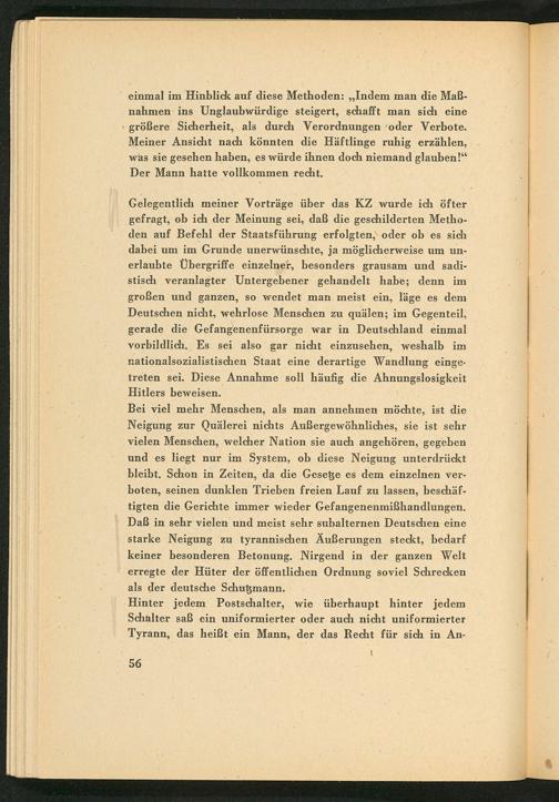 Gelegentlich meiner Vorträge über das KZ wurde ich öfter gefragt, ob ich der Meinung sei, daß die geschilderten Methoden auf Befehl der Staatsführung erfolgten, oder ob es sich dabei um im Grunde unerwünschte, ja möglicherweise um unerlaubte Übergriffe einzelner, besonders grausam und sadistisch veranlagter Untergebener gehandelt habe; denn im großen und ganzen, so wendet man meist ein, läge es dem Deutschen nicht, wehrlose Menschen zu quälen; im Gegenteil, gerade die Gefangenenfürsorge war in Deutschland einmal vorbildlich. Es sei also gar nicht einzusehen, weshalb im nationalsozialistischen Staat eine derartige Wandlung eingetreten sei. Diese Annahme soll häufig die Ahnungslosigkeit Hitlers beweisen.
