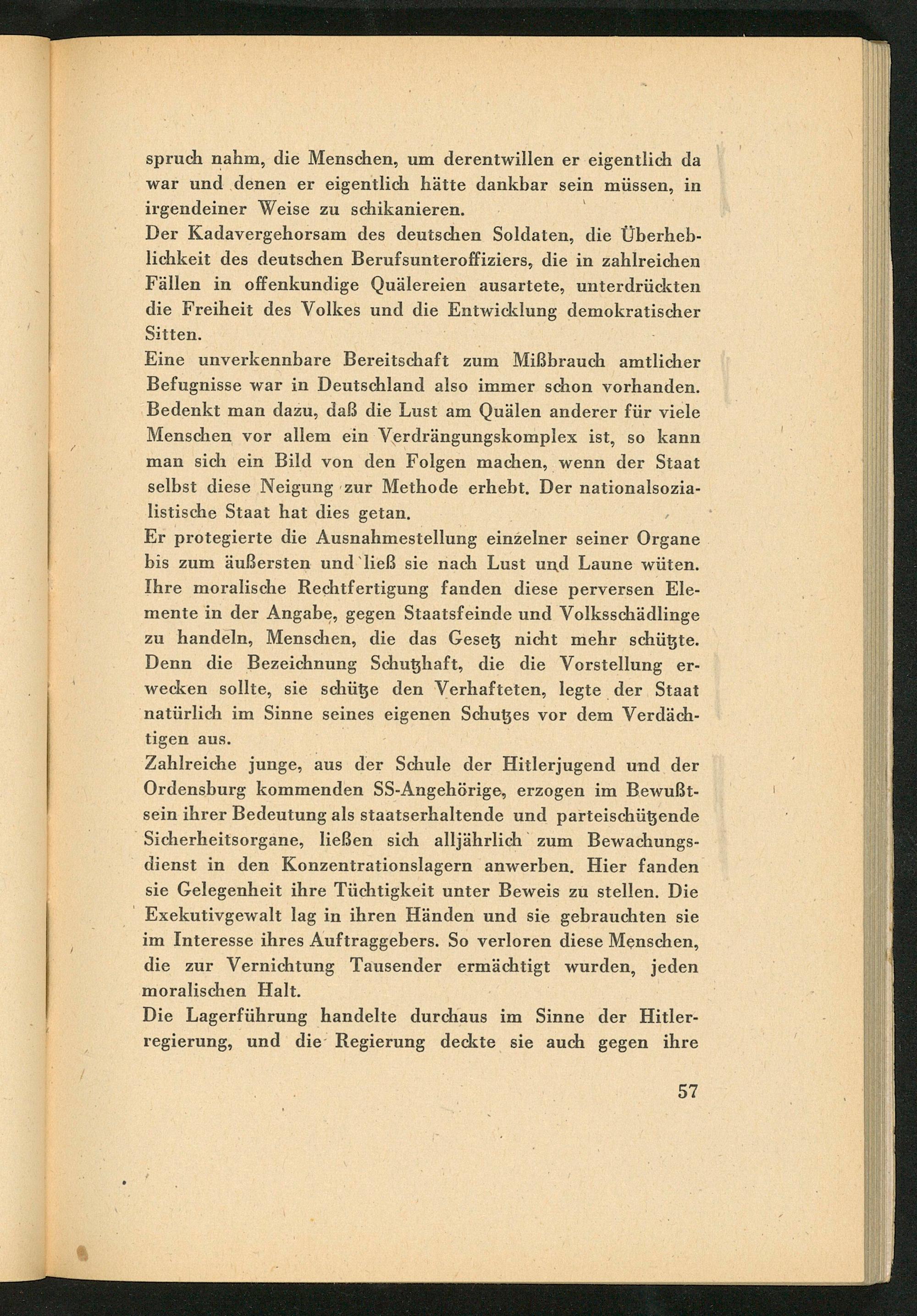 Eine unverkennbare Bereitschaft zum Mißbrauch amtlicher Befugnisse war in Deutschland also immer schon vorhanden. Bedenkt man dazu, daß die Lust am Quälen anderer für viele Menschen vor allem ein Verdrängungskomplex ist, so kann man sich ein Bild von den Folgen machen, wenn der Staat selbst diese Neigung zur Methode erhebt. Der nationalsozialistische Staat hat dies getan.