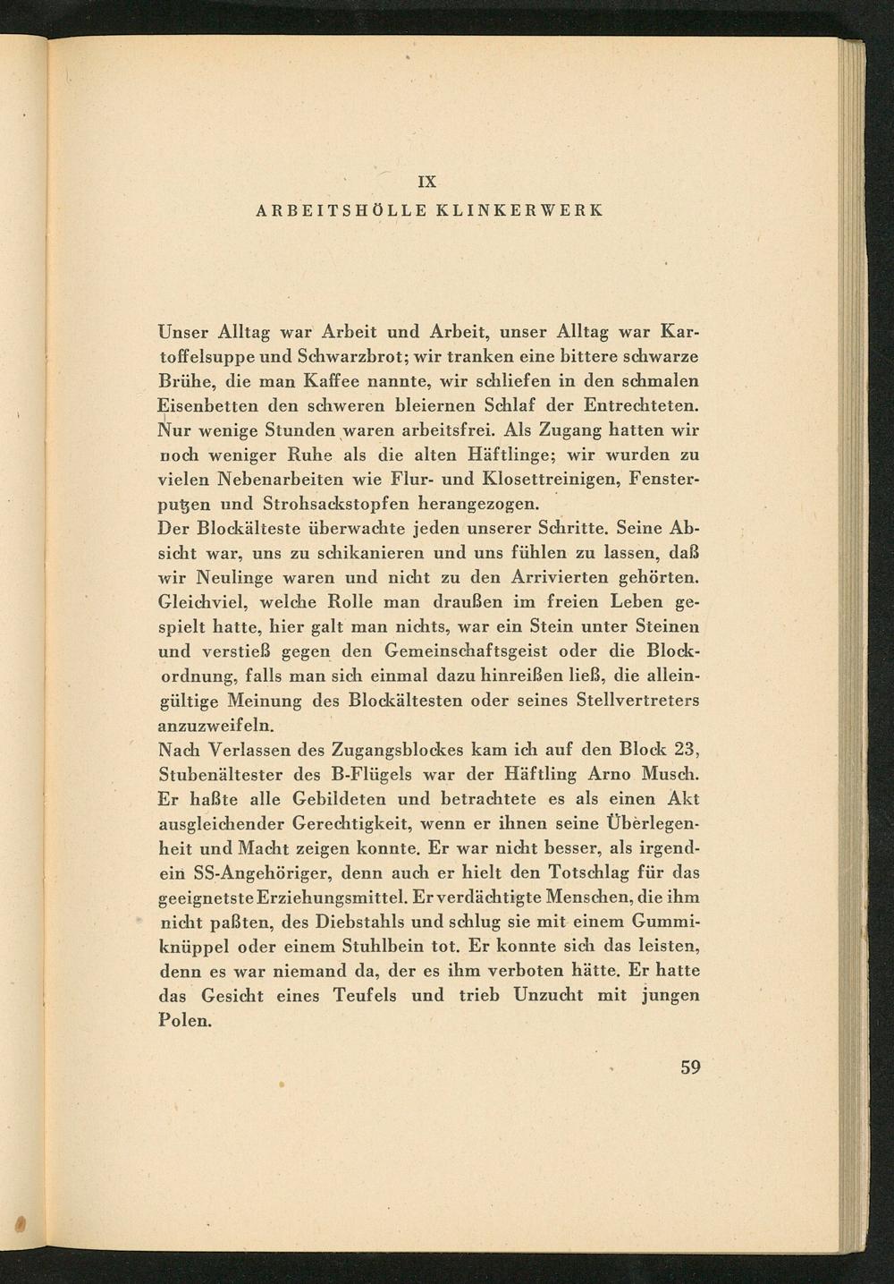 Nach Verlassen des Zugangsblockes kam ich auf den Block 23, Stubenältester des B- Flügels war der Häftling Arno Musch. Er haẞte alle Gebildeten und betrachtete es als einen Akt ausgleichender Gerechtigkeit, wenn er ihnen seine Überlegenheit und Macht zeigen konnte. Er war nicht besser, als irgendein SS- Angehöriger, denn auch er hielt den Totschlag für das geeignetste Erziehungsmittel. Er verdächtigte Menschen, die ihm nicht paẞten, des Diebstahls und schlug sie mit einem Gummiknüppel oder einem Stuhlbein tot. Er konnte sich das leisten, denn es war niemand da, der es ihm verboten hätte. Er hatte das Gesicht eines Teufels und trieb Unzucht mit jungen Polen .