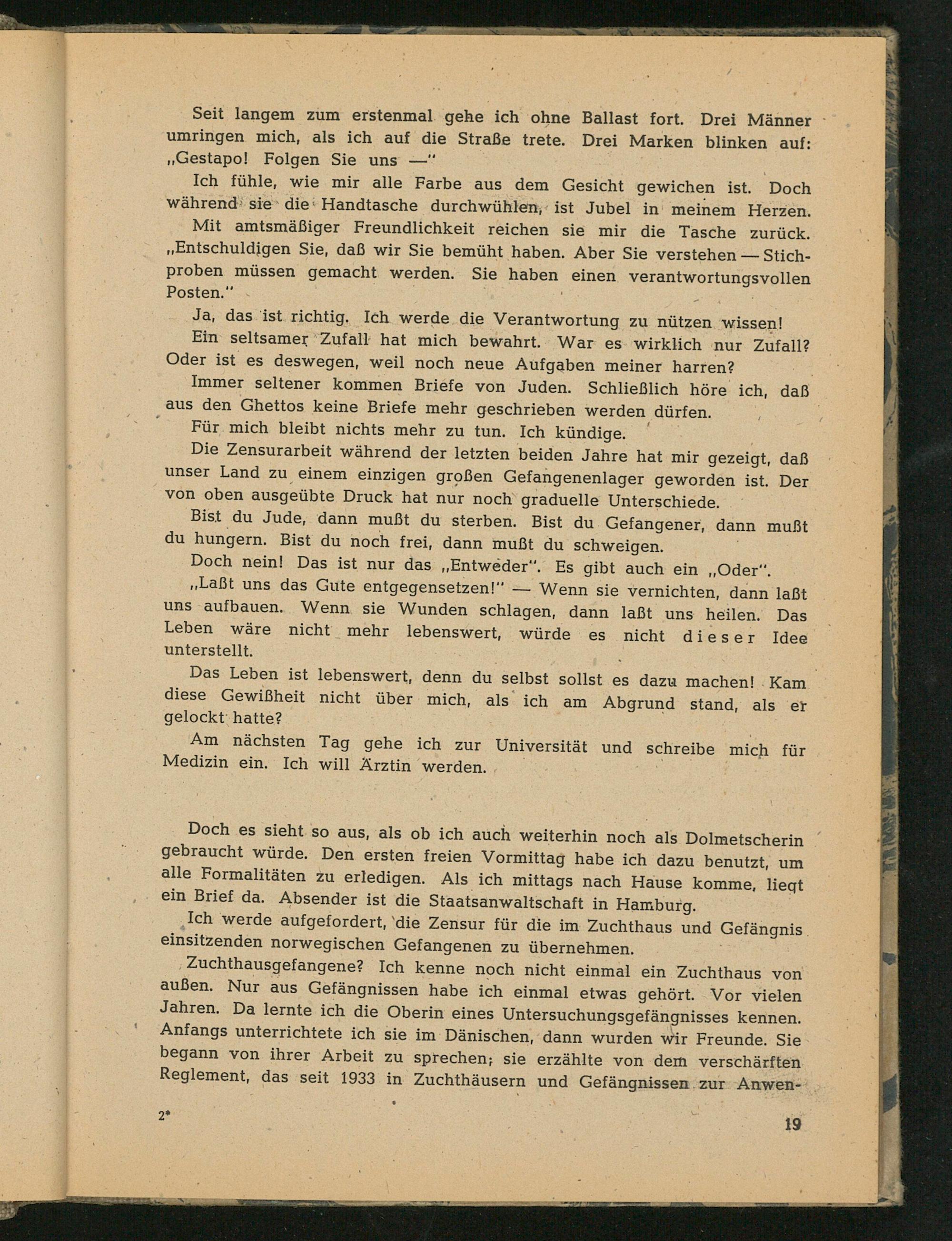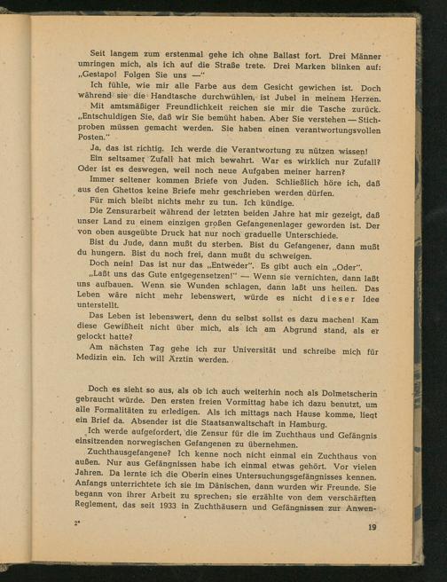 Seit langem zum erstenmal gehe ich ohne Ballast fort. Drei Männer umringen mich, als ich auf die Straße trete. Drei Marken blinken auf: ,, Gestapo ! Folgen Sie uns
