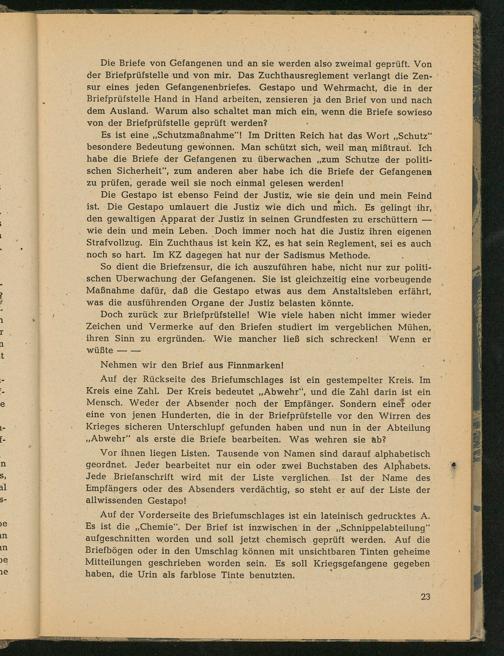 Die Briefe von Gefangenen und an sie werden also zweimal geprüft. Von der Briefprüfstelle und von mir. Das Zuchthausreglement verlangt die Zen- sur eines jeden Gefangenenbriefes. Gestapo und Wehrmacht , die in der Briefprüfstelle Hand in Hand arbeiten, zensieren ja den Brief von und nach dem Ausland.: Warum also schaltet man mich ein, wenn die Briefe sowieso von der Briefprüfstelle geprüft werden?