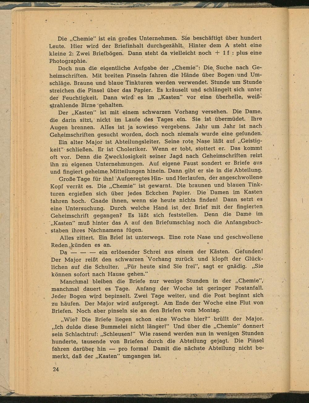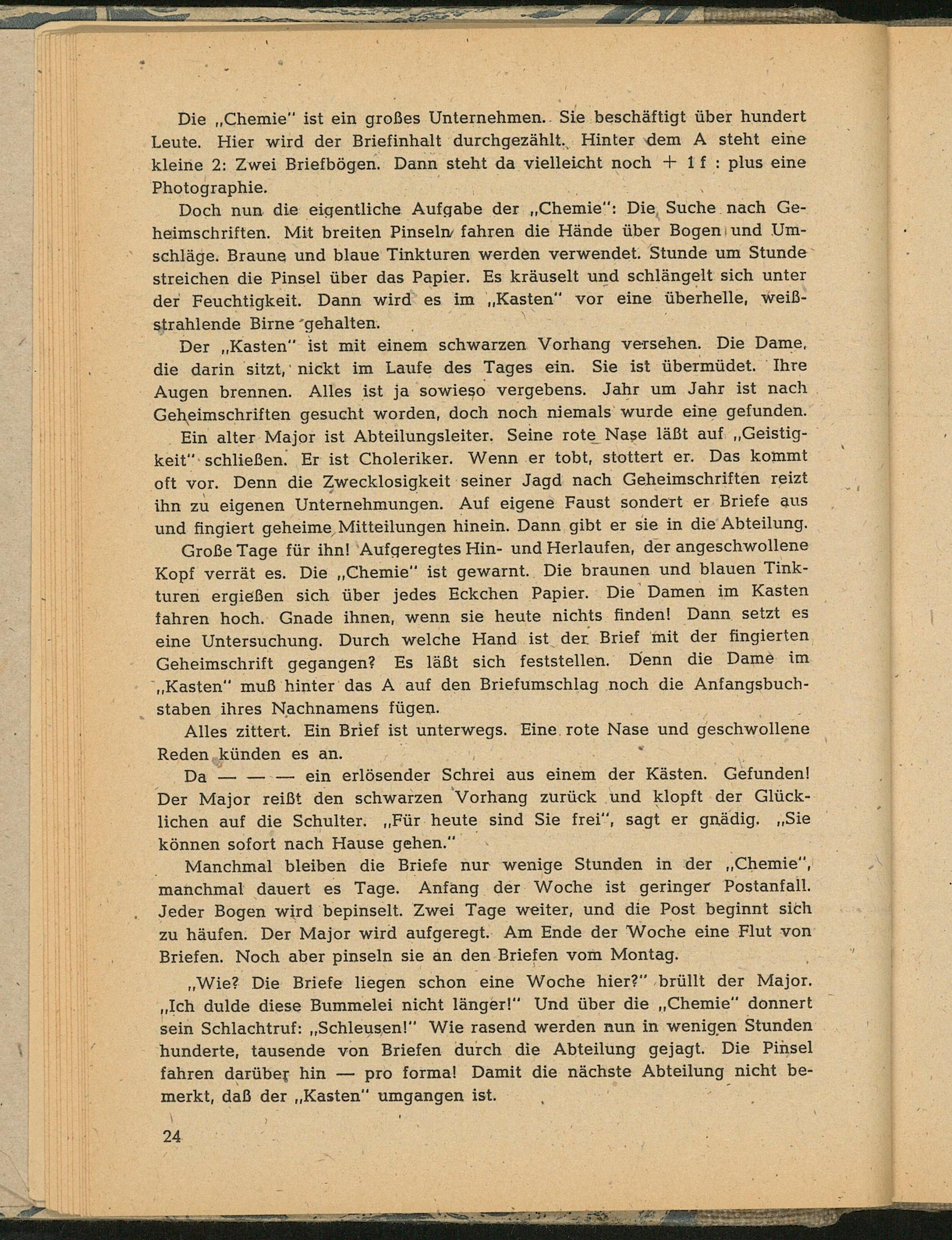 Ein alter Major ist Abteilungsleiter. Seine rote Nase läßt auf ,, Geistigkeit" schließen. Er ist Choleriker. Wenn er tobt, stottert er. Das kommt oft vor. Denn die Zwecklosigkeit seiner Jagd nach Geheimschriften reizt ihn zu eigenen Unternehmungen. Auf eigene Faust sondert er Briefe aus und fingiert geheime Mitteilungen hinein. Dann gibt er sie in die Abteilung. Große Tage für ihn! Aufgeregtes Hin- und Herlaufen, der angeschwollene Kopf verrät es. Die ,, Chemie" ist gewarnt. Die braunen und blauen Tinkturen ergießen sich über jedes Eckchen Papier . Die Damen im Kasten fahren hoch. Gnade ihnen, wenn sie heute nichts finden! Dann setzt es eine Untersuchung. Durch welche Hand ist der Brief mit der fingierten Geheimschrift gegangen? Es läßt sich feststellen. Denn die Dame im ,, Kasten" muß hinter das A auf den Briefumschlag noch die Anfangsbuchstaben ihres Nachnamens fügen.
