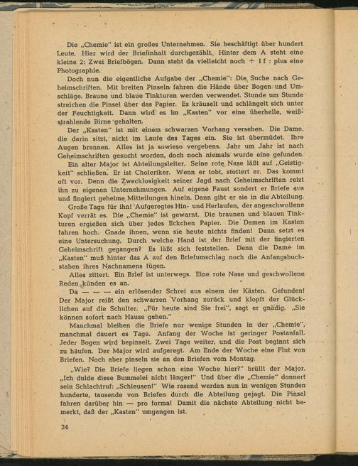 Manchmal bleiben die Briefe nur wenige Stunden in der ,, Chemie", manchmal dauert es Tage. Anfang der Woche ist geringer Postanfall. Jeder Bogen wird bepinselt. Zwei Tage weiter, und die Post beginnt sich zu häufen. Der Major wird aufgeregt. Am Ende der Woche eine Flut von Briefen. Noch aber pinseln sie an den Briefen vom Montag.