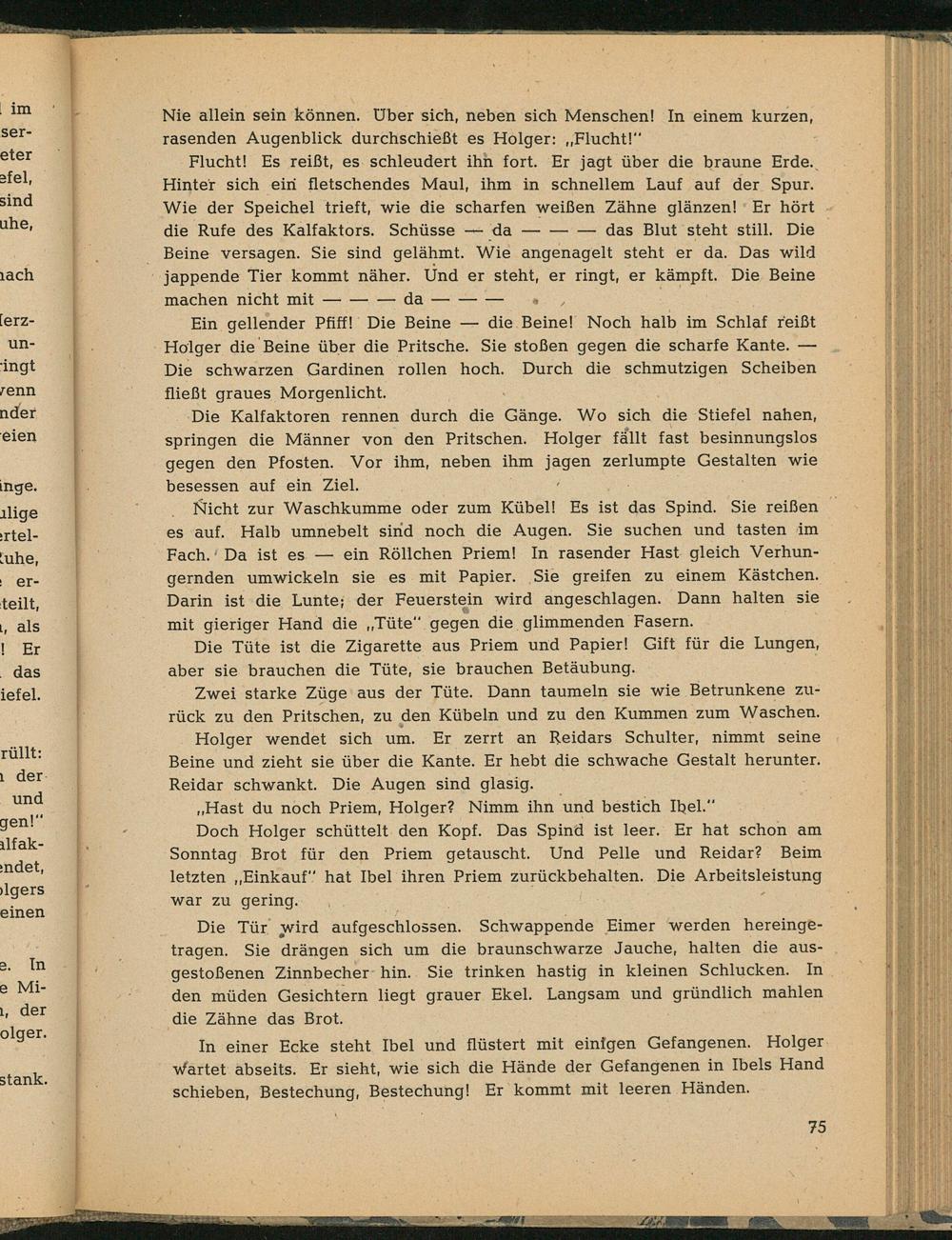 Die Kalfaktoren rennen durch die Gänge. Wo sich die Stiefel nahen, springen die Männer von den Pritschen. Holger fällt fast besinnungslos gegen den Pfosten. Vor ihm, neben ihm jagen zerlumpte Gestalten wie besessen auf ein Ziel.