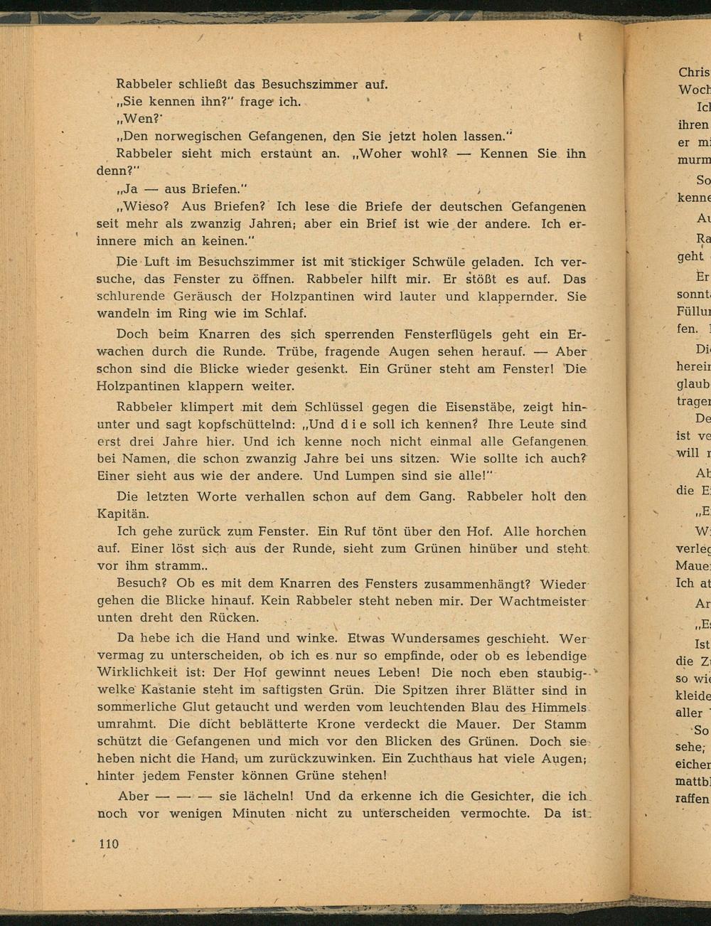 Da hebe ich die Hand und winke. Etwas Wundersames geschieht. Wer vermag zu unterscheiden, ob ich es nur so empfinde, oder ob es lebendige Wirklichkeit ist: Der Hof gewinnt neues Leben! Die noch eben staubig-.* welke Kastanie steht im saftigsten Grün. Die Spitzen ihrer Blätter sind in sommerliche Glut getaucht und werden vom leuchtenden Blau des Himmels umrahmt. Die dicht beblätterte Krone verdeckt die Mauer. Der Stamm schützt die Gefangenen und mich vor den Blicken des Grünen. Doch sie heben nicht die Hand, um zurückzuwinken. Ein Zuchthaus hat viele Augen; hinter jedem Fenster können Grüne stehen!
