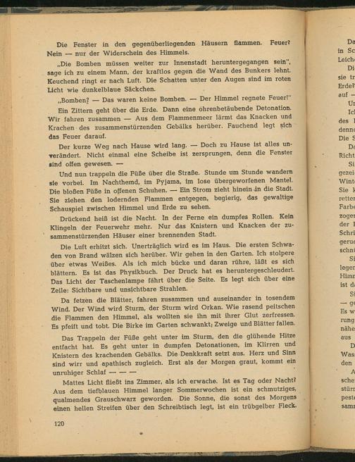 Da fetzen die Blätter, fahren zusammen und auseinander in tosendem Wind. Der Wind wird Sturm, der Sturm wird Orkan. Wie rasend peitschen die Flammen den Himmel, als wollten sie ihn mit ihrer Glut zerfressen. Es pfeift und tobt. Die Birke im Garten schwankt; Zweige und Blätter fallen. Das Trappeln der Füße geht unter im Sturm, den die glühende Hitze entfacht hat. Es geht unter in dumpfen Detonationen, im Klirren und Knistern des krachenden Gebälks. Die Denkkraft setzt aus. Herz und Sinn sind wirr und apathisch zugleich. Erst als der Morgen graut, kommt ein unruhiger Schlaf