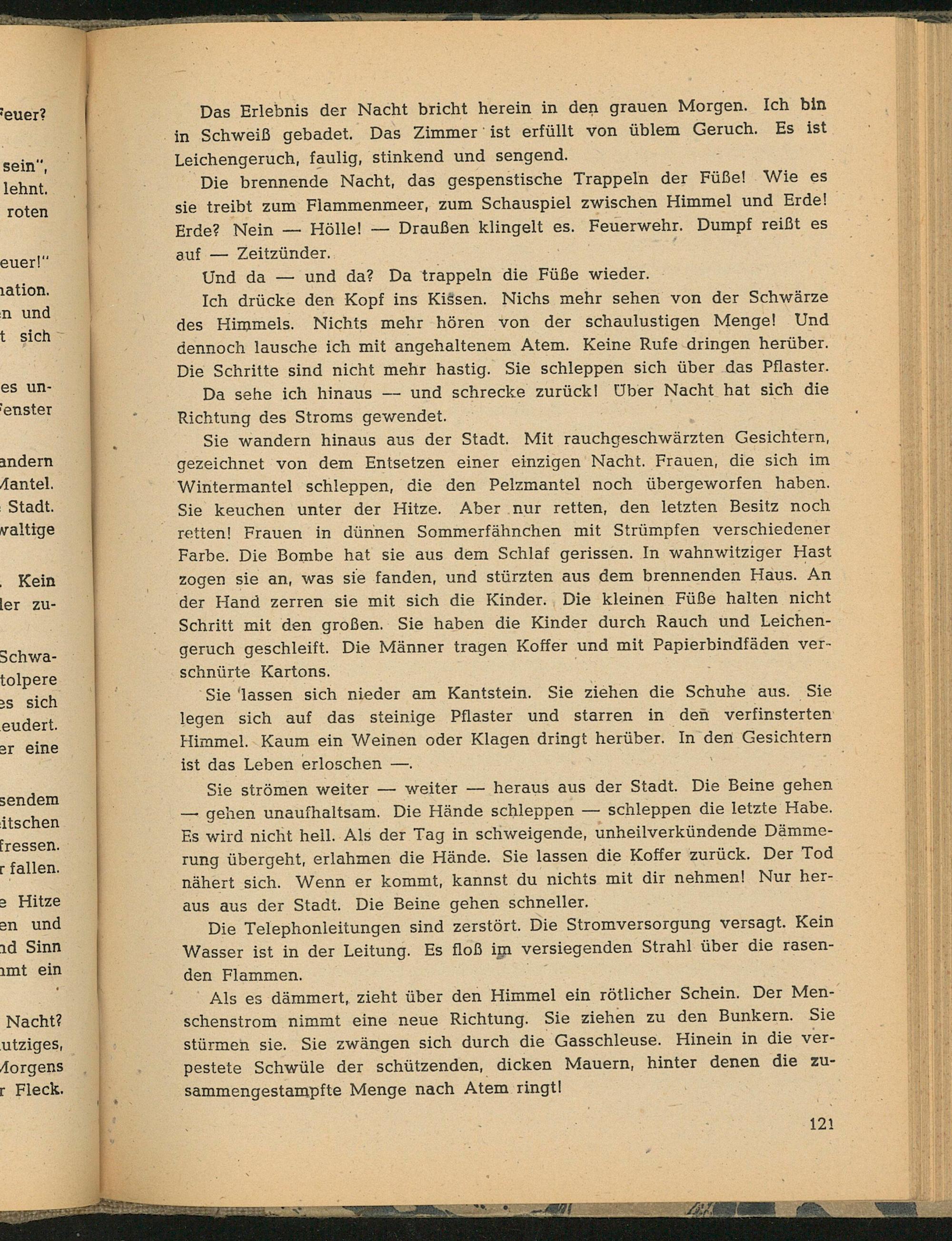 Sie wandern hinaus aus der Stadt. Mit rauchgeschwärzten Gesichtern, gezeichnet von dem Entsetzen einer einzigen Nacht. Frauen, die sich im Wintermantel schleppen, die den Pelzmantel noch übergeworfen haben. Sie keuchen unter der Hitze. Aber nur retten, den letzten Besitz noch retten! Frauen in dünnen Sommerfähnchen mit Strümpfen verschiedener Farbe. Die Bombe hat sie aus dem Schlaf gerissen. In wahnwitziger Hast zogen sie an, was sie fanden, und stürzten aus dem brennenden Haus. An der Hand zerren sie mit sich die Kinder. Die kleinen Füße halten nicht Schritt mit den großen. Sie haben die Kinder durch Rauch und Leichengeruch geschleift. Die Männer tragen Koffer und mit Papierbindfäden verschnürte Kartons.