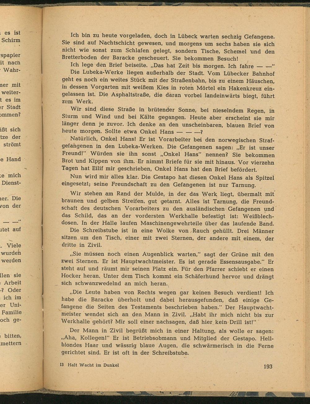 Nun wird mir alles klar. Die Gestapo hat diesen Onkel Hans als Spitzel eingesetzt; seine Freundschaft zu den Gefangenen ist nur Tarnung.