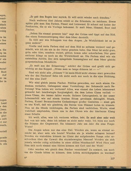 Wir sind gleich jenem Fischer. Fühllos geworden, nur noch einem Gedanken verhaftet, Gefangener einer Vorstellung: der Sehnsucht nach Befreiung! Was haben wir verloren? Alles, was einmal das Leben lebenswert gemacht hat: beschwingte Sorglosigkeit, die, dem Leben Glanz verlieh jenen Glanz, der immer fahler wurde. Sichere Geborgenheit, in der unser Lebensschiff wie auf einem breiten Strom geruhsam dahinglitt. Musik, Farben, Kunst! Berauschendes Gedankengut großer Gestalten einst gab es uns Kraft, daß wir glaubten, die Sterne vom Himmel holen zu können. Nun ist die Musik verklungen, die Farben sind verblichen. Worte, einst wahrhaft empfunden, tönen uns in den Ohren wie der blecherne Klang einer Schelle