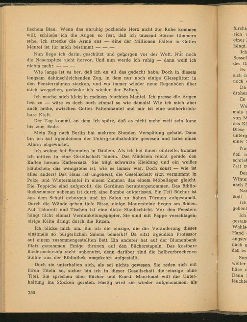 Ich wohne bei Freunden in Dahlem . Als ich bei ihnen eintreffe, komme ich mitten in eine Gesellschaft hinein. Das Mädchen reicht gerade den Kaffee herum: Kaffeersatz . Sie trägt schwarze Kleidung und ein weißes Häubchen; das wenigstens ist, wie es immer war. Doch sonst- wie ist alles anders! Das Haus ist ungeheizt, die Gesellschaft sitzt vermummt in Pelze und Wintermäntel in einem Zimmer, das einem Möbellager gleicht. Die Teppiche sind aufgerollt, die Gardinen heruntergenommen. Das Bibliothekszimmer nebenan ist durch eine Bombe aufgerissen. Ein Teil Bücher ist aus dem Schutt geborgen und im Salon zu hohen Türmen aufgestapelt. Durch die Wände gehen tiefe Risse, einige Mauersteine liegen am Boden. Auf Taburett und Tischen ist eine dicke Staubschicht. Vor den Fenstern hängt nicht einmal Verdunkelungspapier. Sie sind mit Pappe verschlagen; eisige Kälte dringt durch die Ritzen.