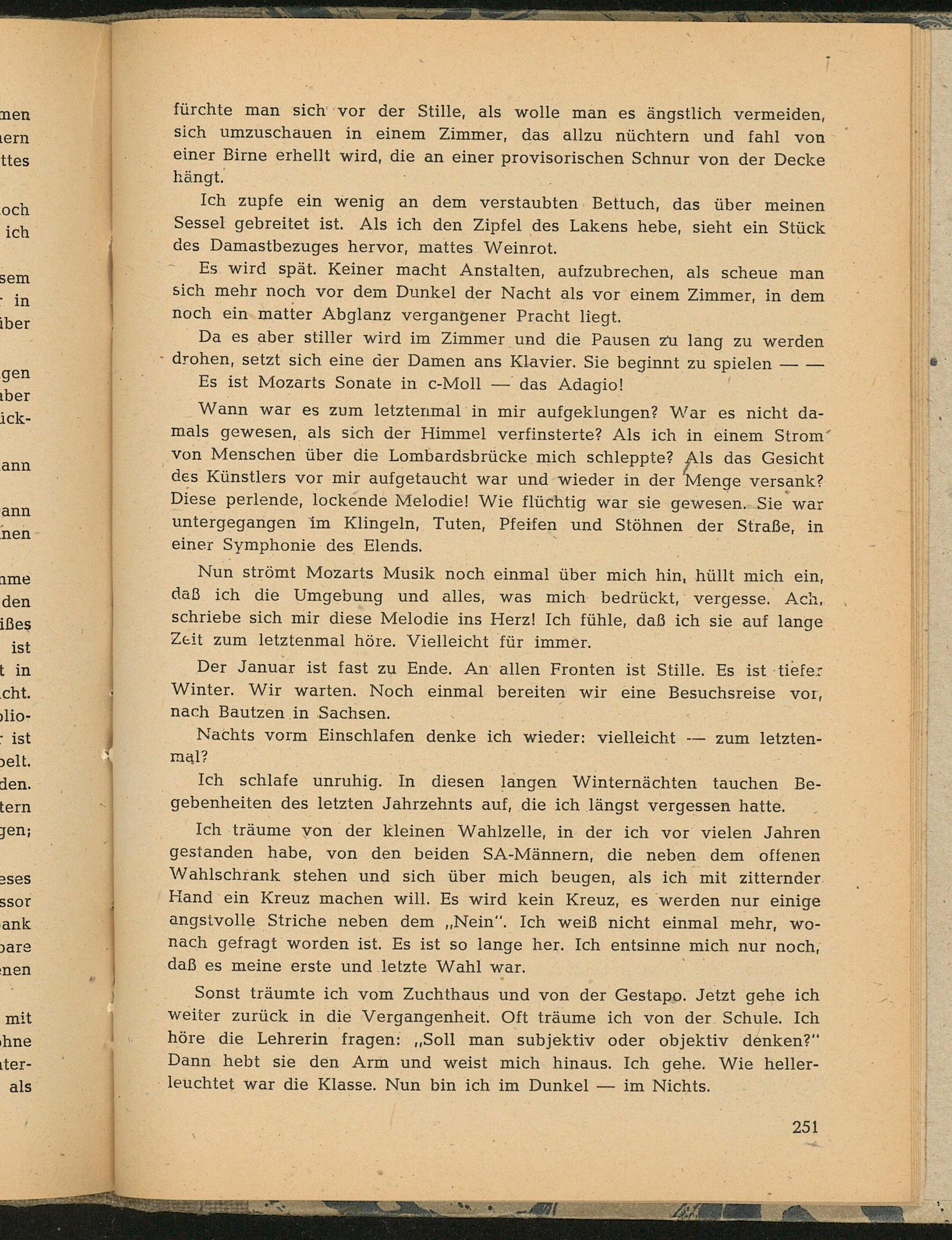 Sonst träumte ich vom Zuchthaus und von der Gestapo . Jetzt gehe ich weiter zurück in die Vergangenheit. Oft träume ich von der Schule. Ich höre die Lehrerin fragen: ,, Soll man subjektiv oder objektiv denken?" Dann hebt sie den Arm und weist mich hinaus. Ich gehe. Wie hellerleuchtet war die Klasse. Nun bin ich im Dunkel im Nichts.