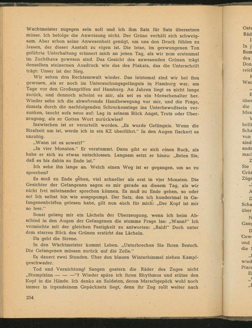 Sonst gelang mir ein Lächeln der Überzeugung, wenn ich beim Abschied in den Augen der Gefangenen die stumme Frage las: ,, Wann?" Ich vermochte mit der gleichen Festigkeit zu antworten: ,, Bald!" Doch unter dem starren Blick des Grünen erstirbt das Lächeln.