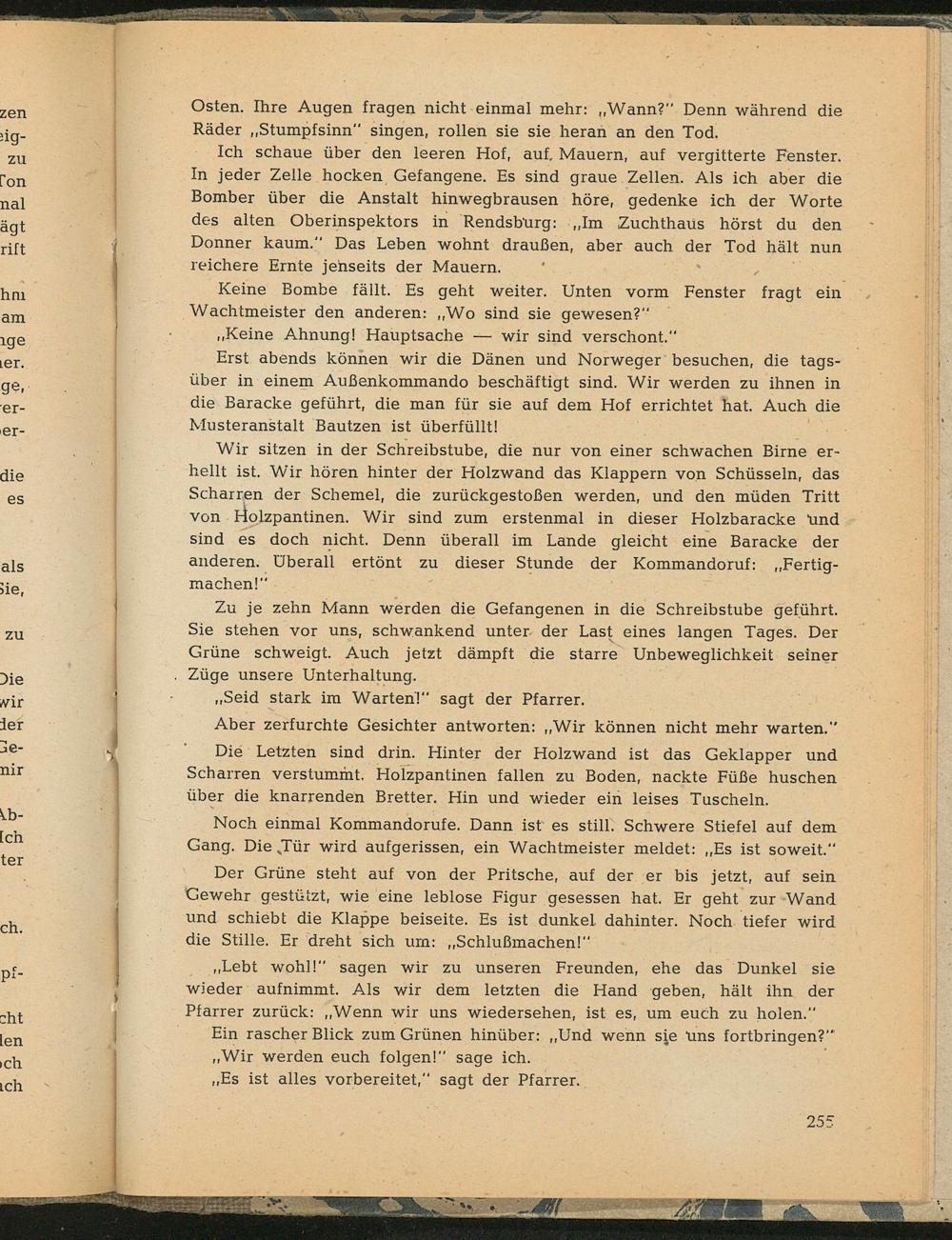 ,, Lebt wohl!" sagen wir zu unseren Freunden, ehe das Dunkel sie wieder aufnimmt. Als wir dem letzten die Hand geben, hält ihn der Pfarrer zurück: ,, Wenn wir uns wiedersehen, ist es, um euch zu holen." Ein rascher Blick zum Grünen hinüber: ,, Und wenn sie uns fortbringen?" ,, Wir werden euch folgen!" sage ich.