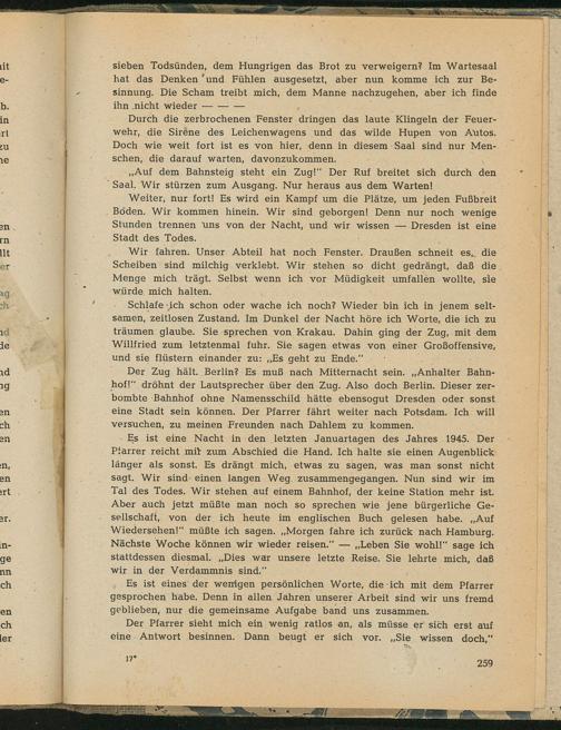 - Es ist eine Nacht in den letzten Januartagen des Jahres 1945. Der Piarrer reicht mit zum Abschied die Hand. Ich halte sie einen Augenblick länger als sonst. Es drängt mich, etwas zu sagen, was man sonst nicht sagt. Wir sind‘ einen langen Weg zusammengegangen. Nun sind wir im Tal des Todes. Wir stehen auf einem Bahnhof, der keine Station mehr ist. Aber auch jetzt müßte man noch so sprechen wie jene bürgerliche Ge- sellschaft,, von der ich heute im englischen Buch gelesen habe.„Auf Wiedersehen!” müßte ich sagen.„Morgen enle ich zurück nach Hamburg . Nächste Woche können wir wieder reisen."—„Leben Sie wohl!" sage ich stattdessen diesmal.„Dies war unsere letzte Reise. Sie lehrte mich, daß wir in der Verdammnis sind.“