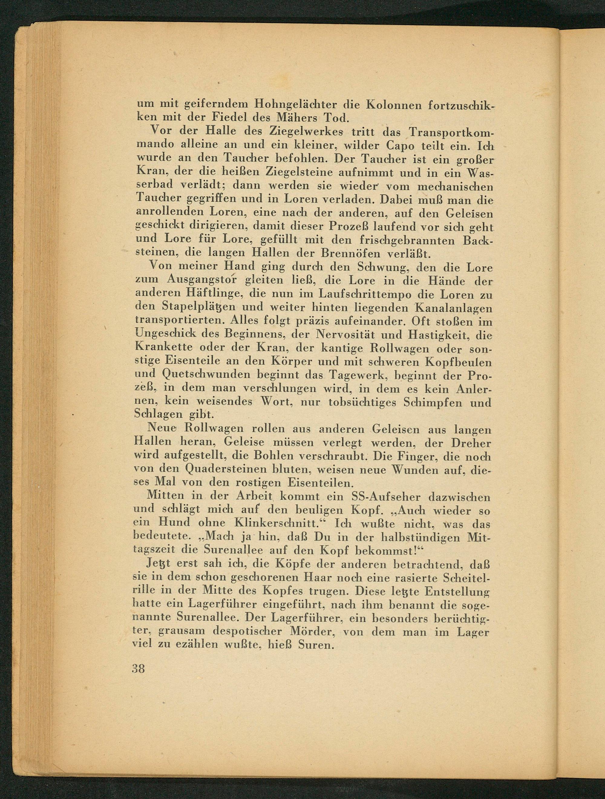 Vor der Halle des Ziegelwerkes tritt das Transportkommando alleine an und ein kleiner, wilder Capo teilt ein. Ich wurde an den Taucher befohlen. Der Taucher ist ein großer Kran, der die heißen Ziegelsteine aufnimmt und in ein Wasserbad verlädt; dann werden sie wieder vom mechanischen Taucher gegriffen und in Loren verladen. Dabei muß man die anrollenden Loren, eine nach der anderen, auf den Geleisen geschickt dirigieren, damit dieser Prozeß laufend vor sich geht. und Lore für Lore, gefüllt mit den frischgebrannten Backsteinen, die langen Hallen der Brennöfen verläßt.
