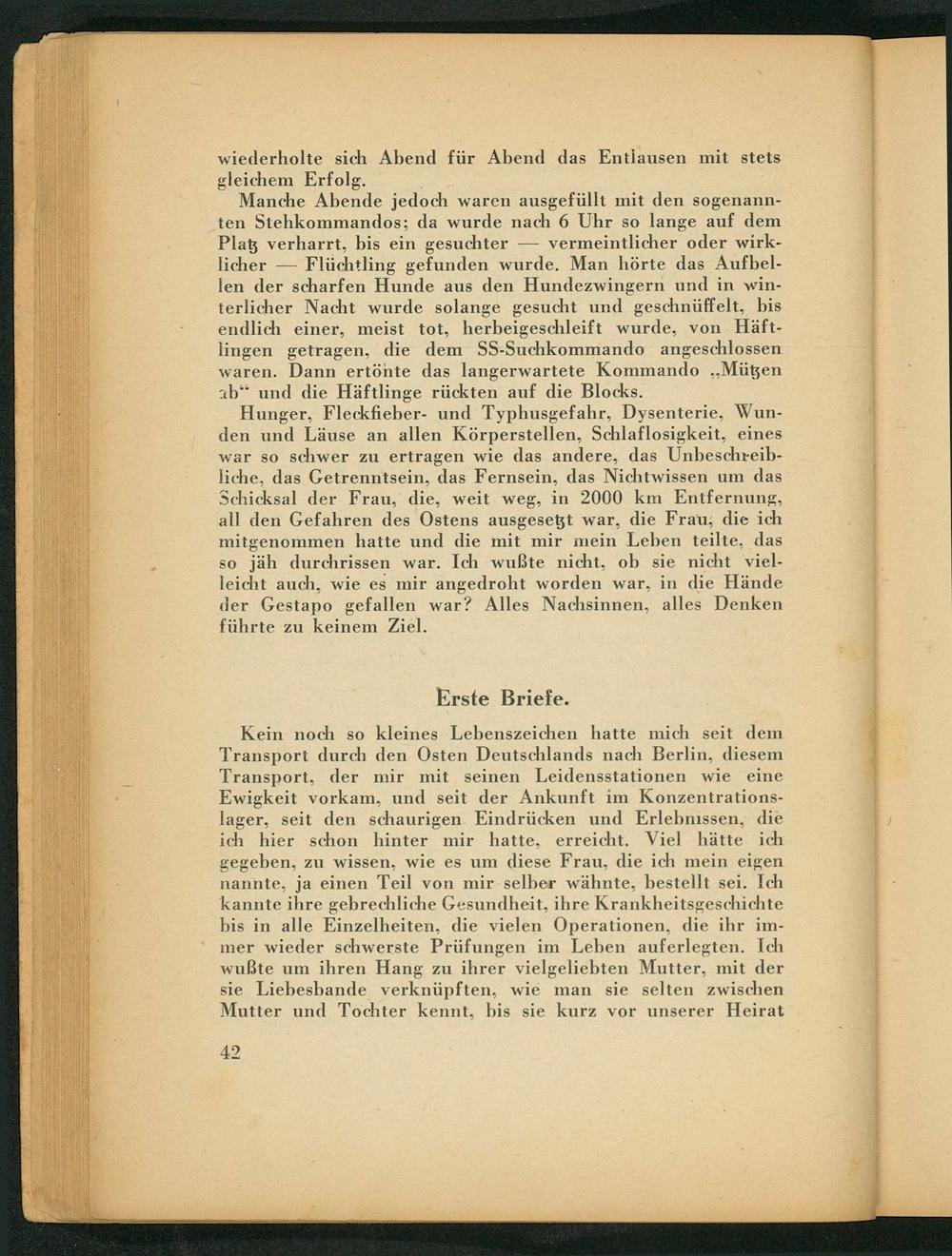 Hunger, Fleckfieber- und Typhusgefahr, Dysenterie, Wunden und Läuse an allen Körperstellen, Schlaflosigkeit, eines war so schwer zu ertragen wie das andere, das Unbeschreibliche, das Getrennt sein, das Fernsein, das Nichtwissen um das Schicksal der Frau, die, weit weg, in 2000 km Entfernung, all den Gefahren des Ostens ausgesetzt war, die Frau, die ich mitgenommen hatte und die mit mir mein Leben teilte, das so jäh durchrissen war. Ich wußte nicht, ob sie nicht vielleicht auch, wie es mir angedroht worden war, in die Hände der Gestapo gefallen war? Alles Nachsinnen, alles Denken führte zu keinem Ziel.