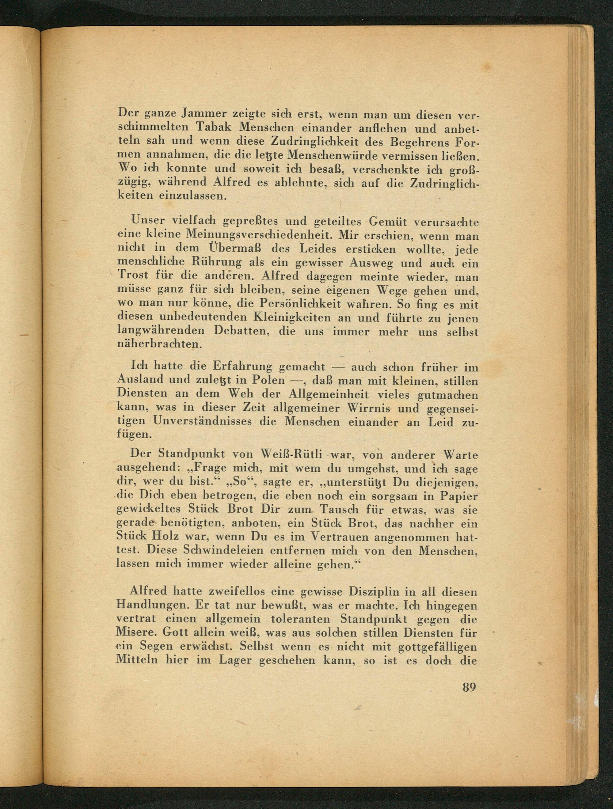 Der Standpunkt von Weiß- Rütli war, von anderer Warte ausgehend: ,, Frage mich, mit wem du umgehst, und ich sage dir, wer du bist." ,, So", sagte er ,,, unterstützt Du diejenigen, die Dich eben betrogen, die eben noch ein sorgsam in Papier gewickeltes Stück Brot Dir zum Tausch für etwas, was sie gerade benötigten, anboten, ein Stück Brot, das nachher ein Stück Holz war, wenn Du es im Vertrauen angenommen hattest. Diese Schwindeleien entfernen mich von den Menschen, lassen mich immer wieder alleine gehen.“