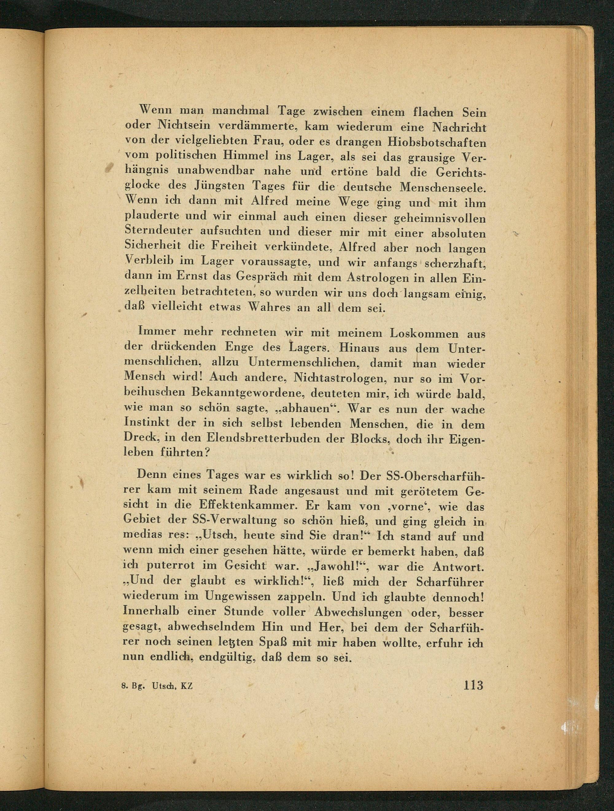Denn eines Tages war es wirklich so! Der SS- Oberscharführer kam mit seinem Rade angesaust und mit gerötetem Gesicht in die Effektenkammer. Er kam von vorne', wie das Gebiet der SS - Verwaltung so schön hieß, und ging gleich in medias res: ,, Utsch, heute sind Sie dran!" Ich stand auf und wenn mich einer gesehen hätte, würde er bemerkt haben, daß ich puterrot im Gesicht war.„ ,, Jawohl!", war die Antwort. ,, Und der glaubt es wirklich!", ließ mich der Scharführer wiederum im Ungewissen zappeln. Und ich glaubte dennoch! Innerhalb einer Stunde voller Abwechslungen oder, besser gesagt, abwechselndem Hin und Her, bei dem der Scharführer noch seinen letzten Spaß mit mir haben wollte, erfuhr ich nun endlich, endgültig, daß dem so sei.