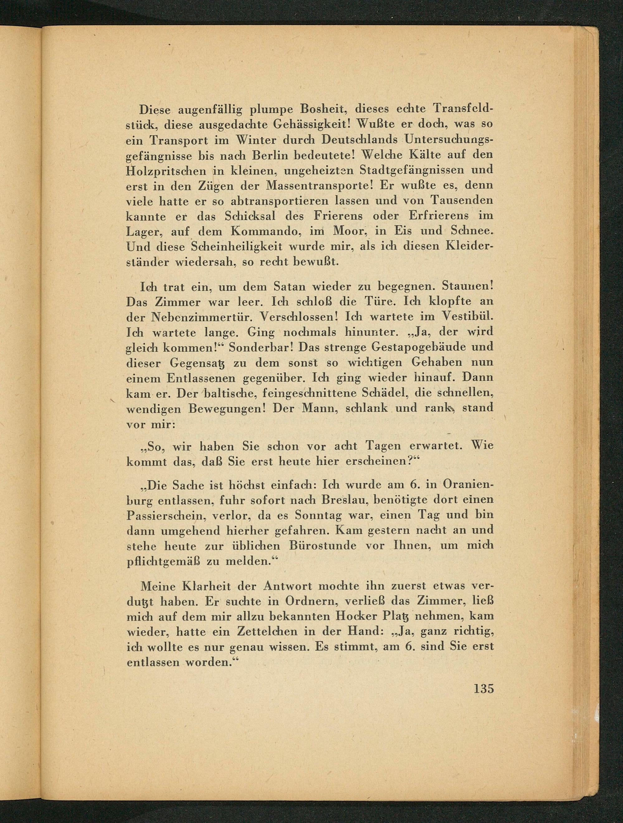 ,, Die Sache ist höchst einfach: Ich wurde am 6. in Oranien­burg entlassen, fuhr sofort nach Breslau , benötigte dort einen Passierschein, verlor, da es Sonntag war, einen Tag und bin dann umgehend hierher gefahren. Kam gestern nacht an und stehe heute zur üblichen Bürostunde vor Ihnen, um mich pflichtgemäß zu melden."