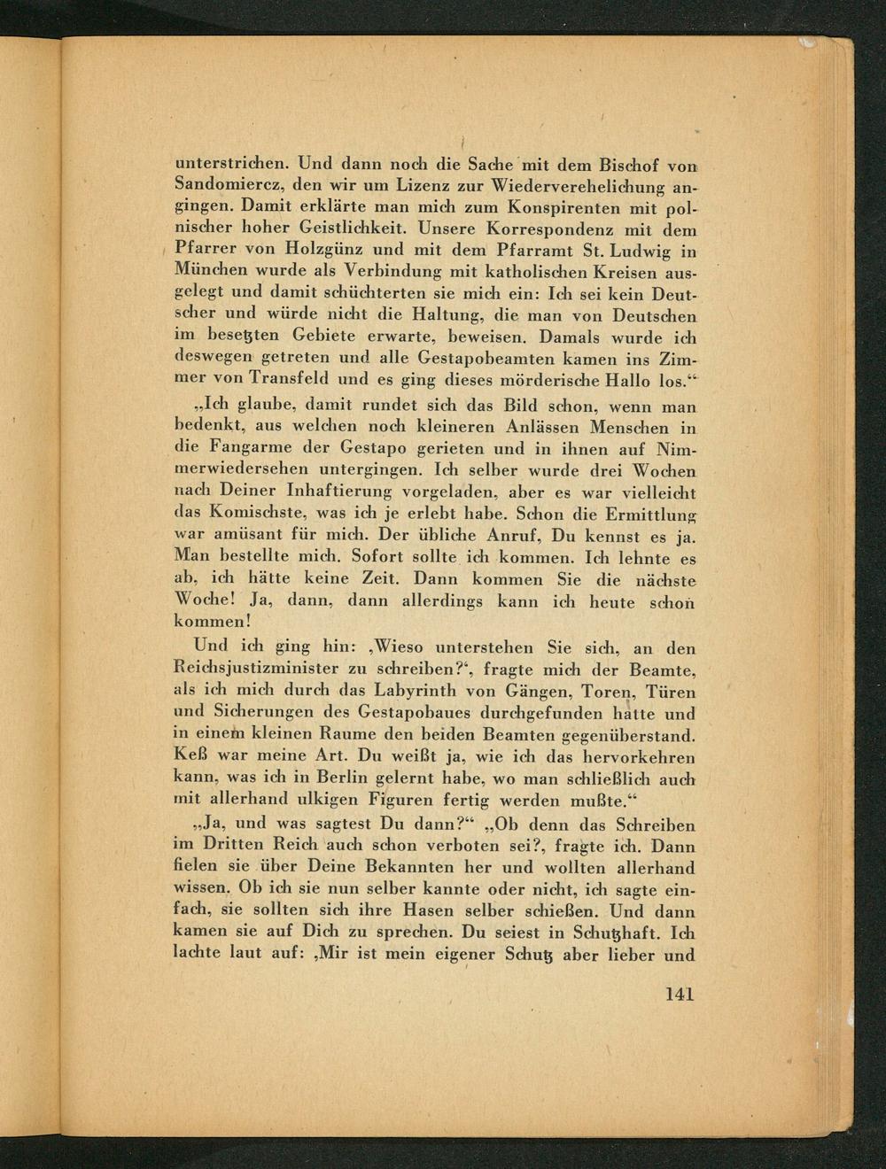 unterstrichen. Und dann noch die Sache mit dem Bischof von Sandomiercz, den wir um Lizenz zur Wiederverehelichung angingen. Damit erklärte man mich zum Konspirenten mit polnischer hoher Geistlichkeit. Unsere Korrespondenz mit dem Pfarrer von Holzgünz und mit dem Pfarramt St. Ludwig in München wurde als Verbindung mit katholischen Kreisen ausgelegt und damit schüchterten sie mich ein: Ich sei kein Deutscher und würde nicht die Haltung, die man von Deutschen im besetzten Gebiete erwarte, beweisen. Damals wurde ich deswegen getreten und alle Gestapobeamten kamen ins Zimmer von Transfeld und es ging dieses mörderische Hallo los."