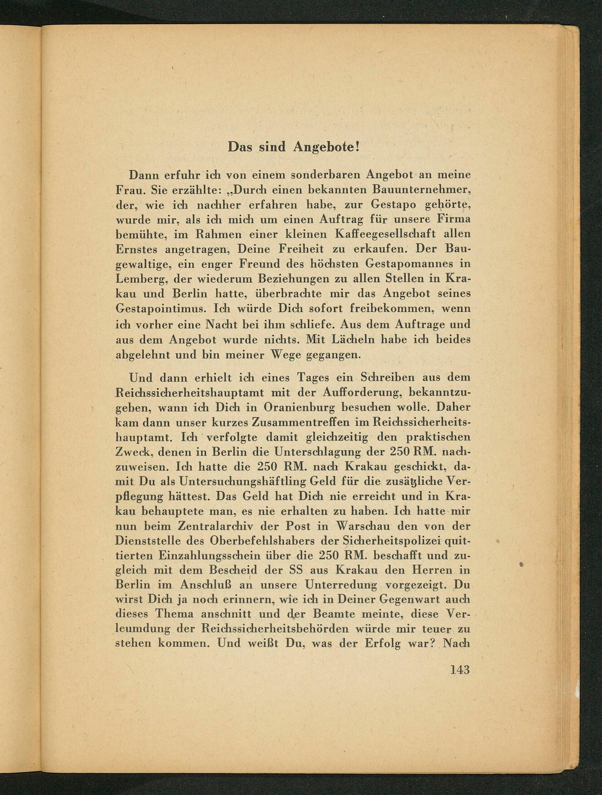 Und dann erhielt ich eines Tages ein Schreiben aus dem Reichssicherheitshauptamt mit der Aufforderung, bekanntzu- geben, wann ich Dich in Oranienburg besuchen wolle. Daher kam dann unser kurzes Zusammentreffen im Reichssicherheits- hauptamt. Ich verfolgte damit gleichzeitig den praktischen Zweck, denen in Berlin die Unterschlagung der 250 RM. nach- zuweisen. Ich hatte die 250 RM. nach Krakau geschickt, da- mit Du als Untersuchungshäftling Geld für die zusägliche Ver- pflegung hättest. Das Geld hat Dich nie erreicht und in Kra- kau behauptete man, es nie erhalten zu haben. Ich hatte mir nun beim Zentralarchiv der Post in Warschau den von der Dienststelle des Oberbefehlshabers der Sicherheitspolizei quit- tierten Einzahlungsschein über die 250 RM. beschafft und zu- gleich mit dem Bescheid der SS aus Krakau den Herren in Berlin im Anschluß an unsere Unterredung vorgezeigt. Du wirst Dich ja noch erinnern, wie ich in Deiner Gegenwart auch dieses Thema anschnitt und der Beamte meinte, diese Ver- leumdung der Reichssicherheitsbehörden würde mir teuer zu stehen kommen. Und weißt Du, was der Erfolg war? Nach