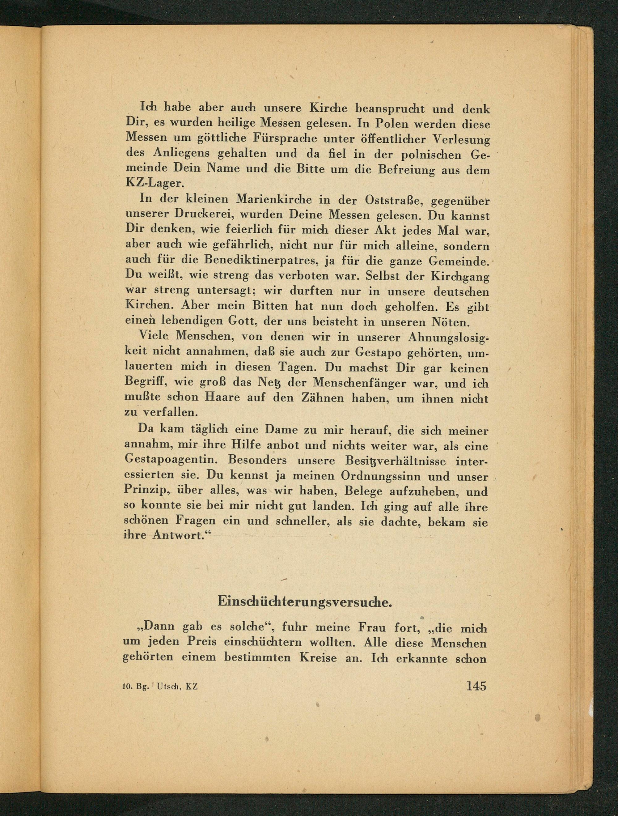 In der kleinen Marienkirche in der Oststraße, gegenüber unserer Druckerei, wurden Deine Messen gelesen. Du kannst Dir denken, wie feierlich für mich dieser Akt jedes Mal war, aber auch wie gefährlich, nicht nur für mich alleine, sondern auch für die Benediktinerpatres, ja für die ganze Gemeinde. Du weißt, wie streng das verboten war. Selbst der Kirchgang war streng untersagt; wir durften nur in unsere deutschen Kirchen. Aber mein Bitten hat nun doch geholfen. Es gibt einen lebendigen Gott, der uns beisteht in unseren Nöten.
