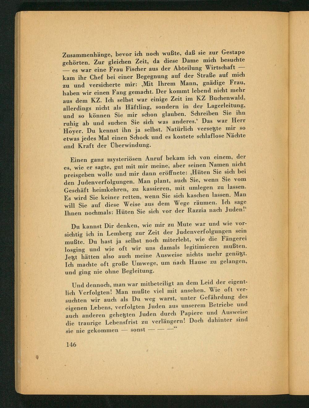 Du kannst Dir denken, wie mir zu Mute war und wie vorsichtig ich in Lemberg zur Zeit der Judenverfolgungen sein mußte. Du hast ja selbst noch miterlebt, wie die Fängerei losging und wie oft wir uns damals legitimieren mußten. Jetzt hätten also auch meine Ausweise nichts mehr genützt. Ich machte oft große Umwege, um nach Hause zu gelangen, und ging nie ohne Begleitung.